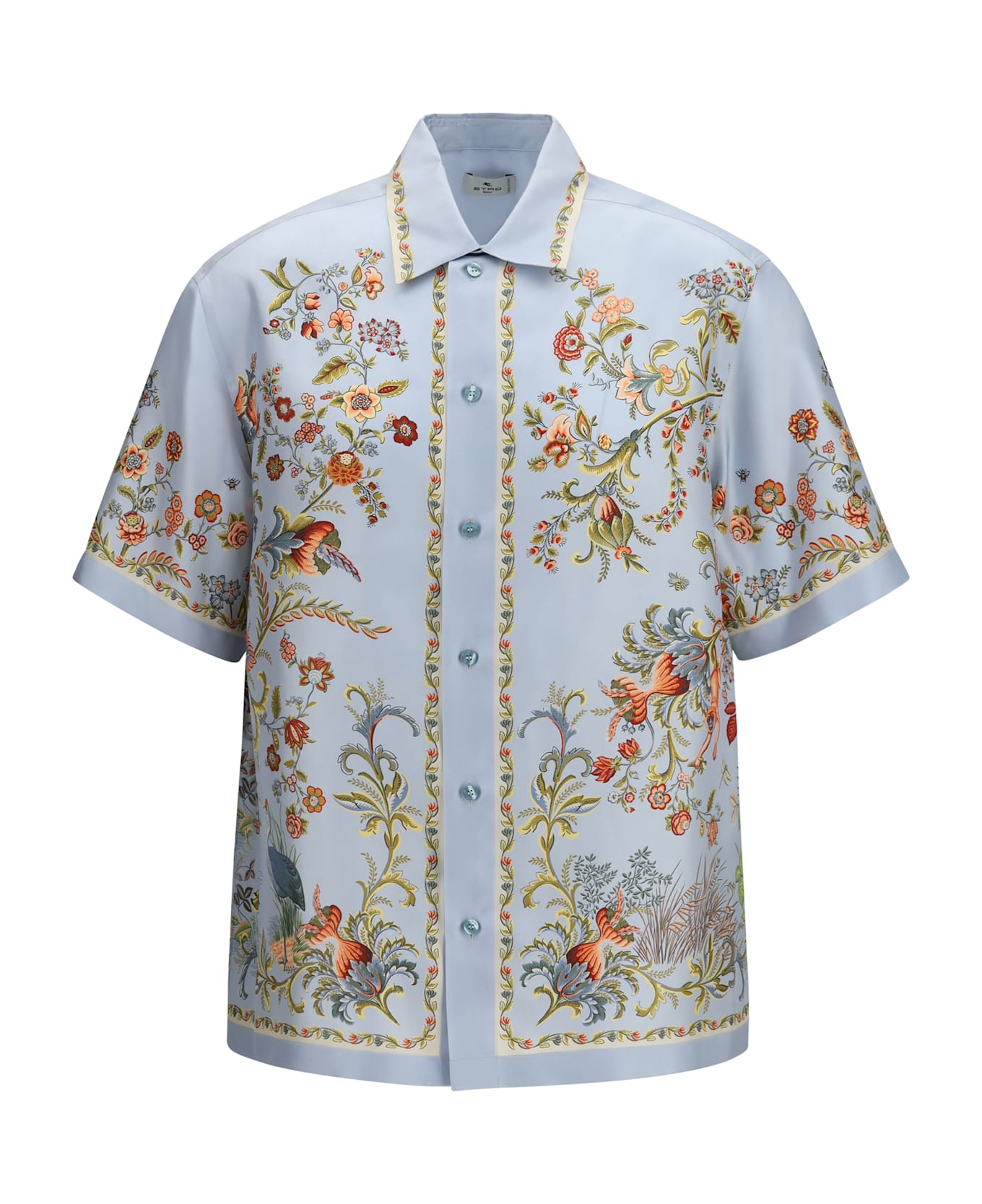 The oversized silk shirt with flora and fauna print by etro is crafted from luxurious pure silk twill and stands out for its elegant design enriched with decorative details. the model features a placed print inspired by natural flora and fauna, enhanced by a subtle floral pattern along the edges. the easy fit silhouette and short sleeves create a relaxed yet refined look, while the pointed collar and branded button closure complete the design. the garment is entirely made in italy. Composition: 100% % Silk