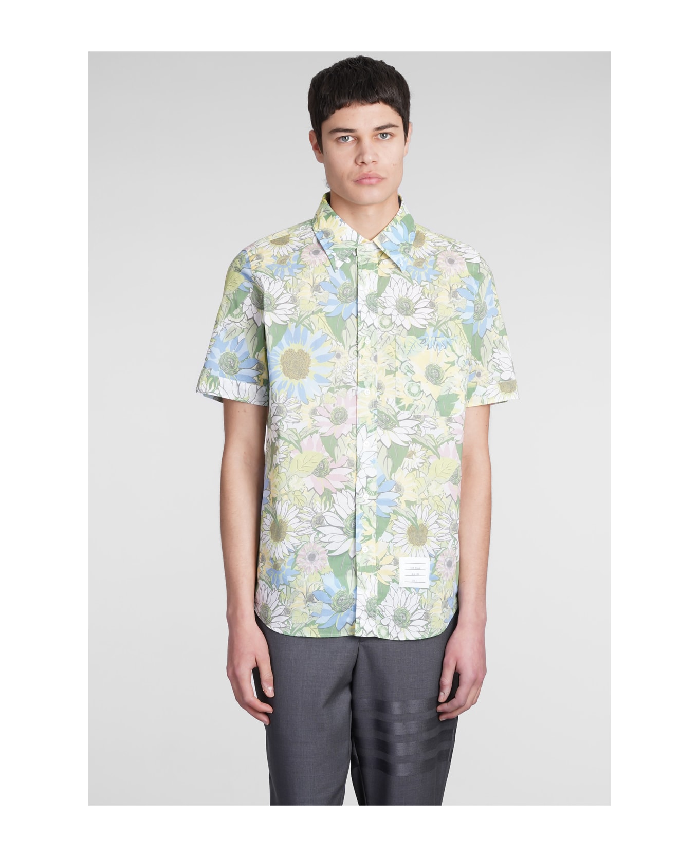 Shirt in green cotton, collar, frontal buttoning, short sleeves, floral print, logo patch on front, 100% cotton, Made in Italy, Model is 1. 83 and wears size 3