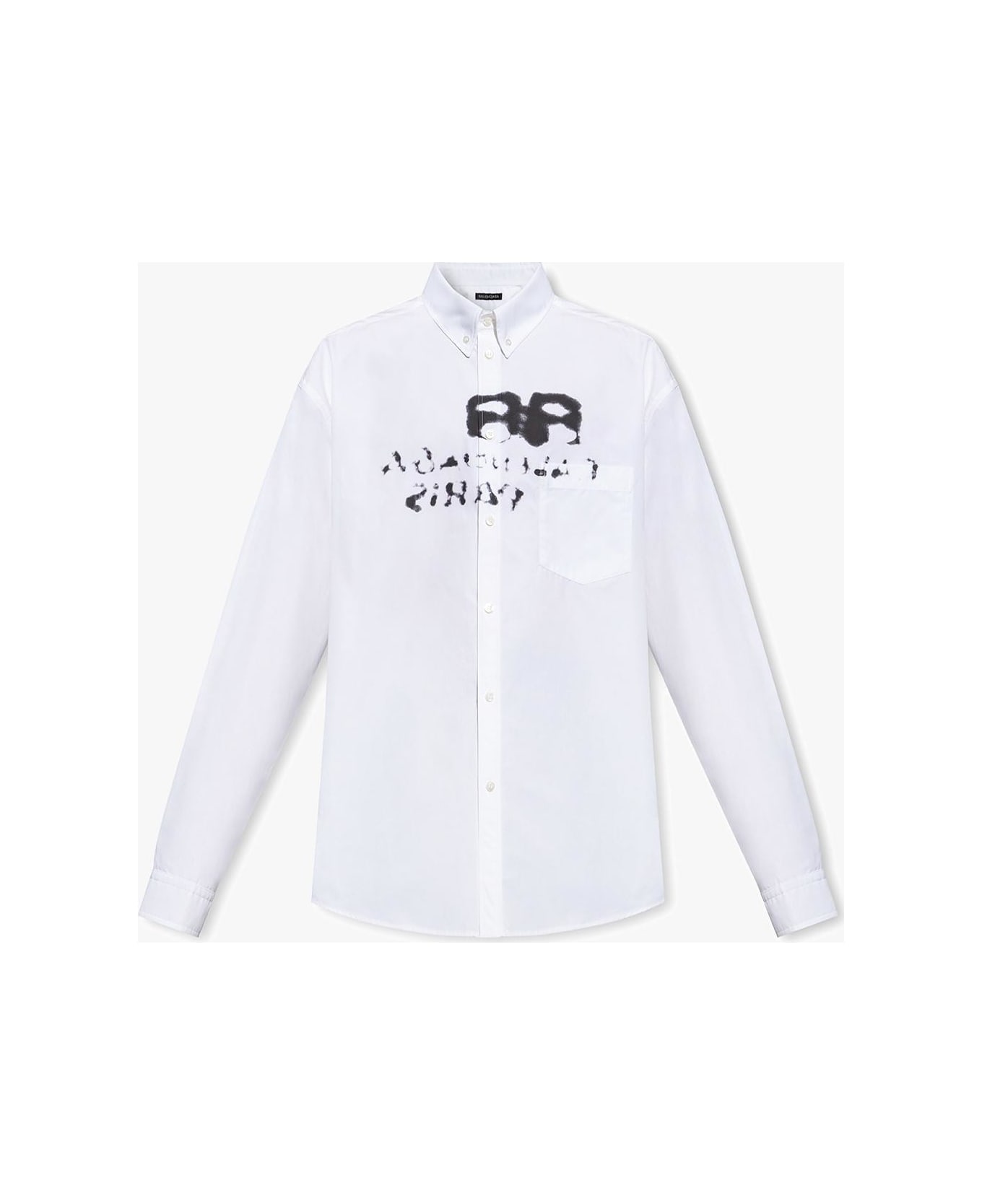 White loose-fitting shirt from Balenciaga. Made of cotton, this garment is complete with buttons, black logo print, front pocket and long sleeves with buttoned cuffs. Composition: 100% Cotton