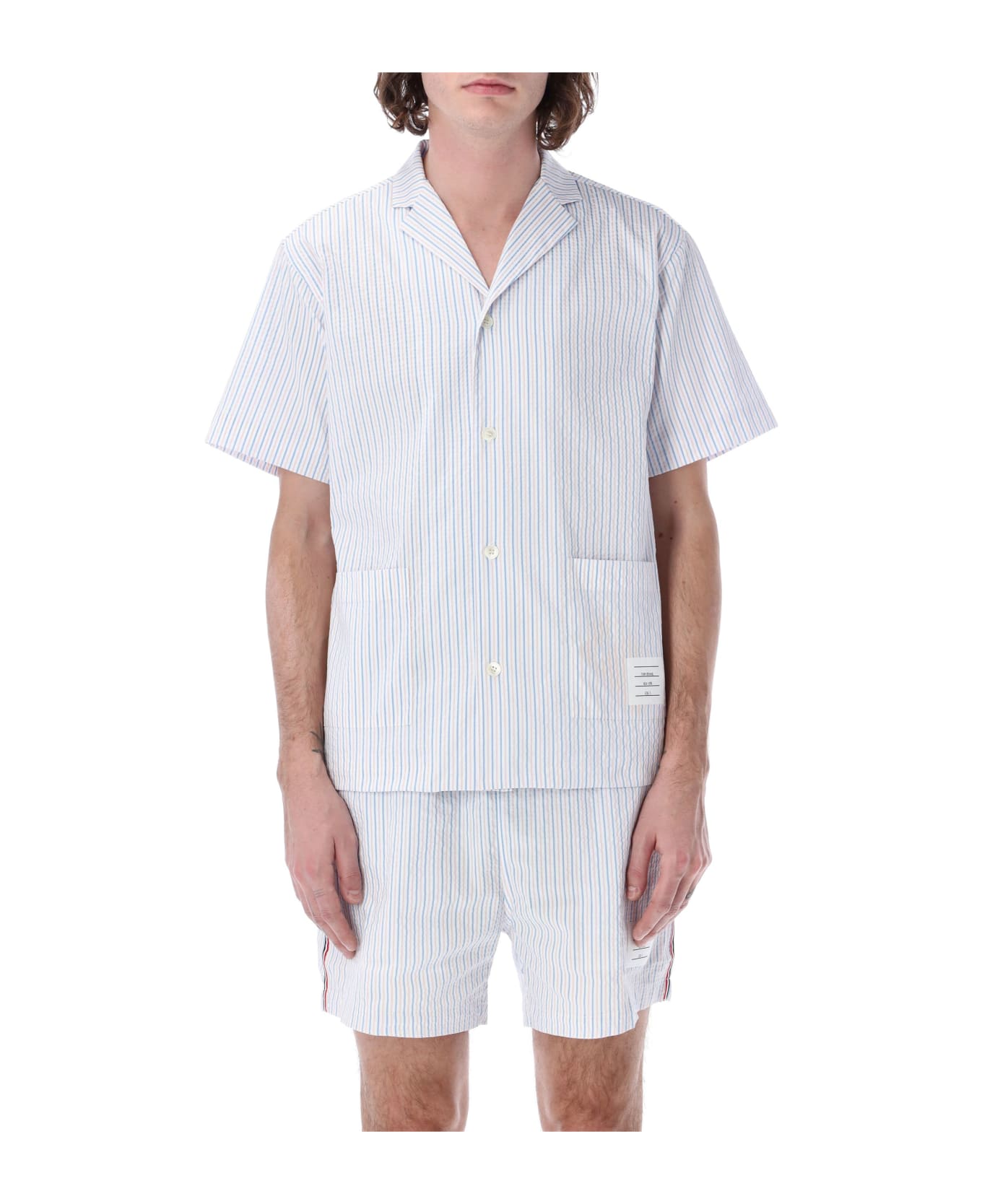 Swim Shirt In Swim Seersucker By Thom Browne. Featuring: Notch Lapel Front Button Fastening Short Sleeves Striped Pattern Patch Pockets Straight Hem Mesh Lining Model Is 1,90 M Tall And He's Wearing Size 3