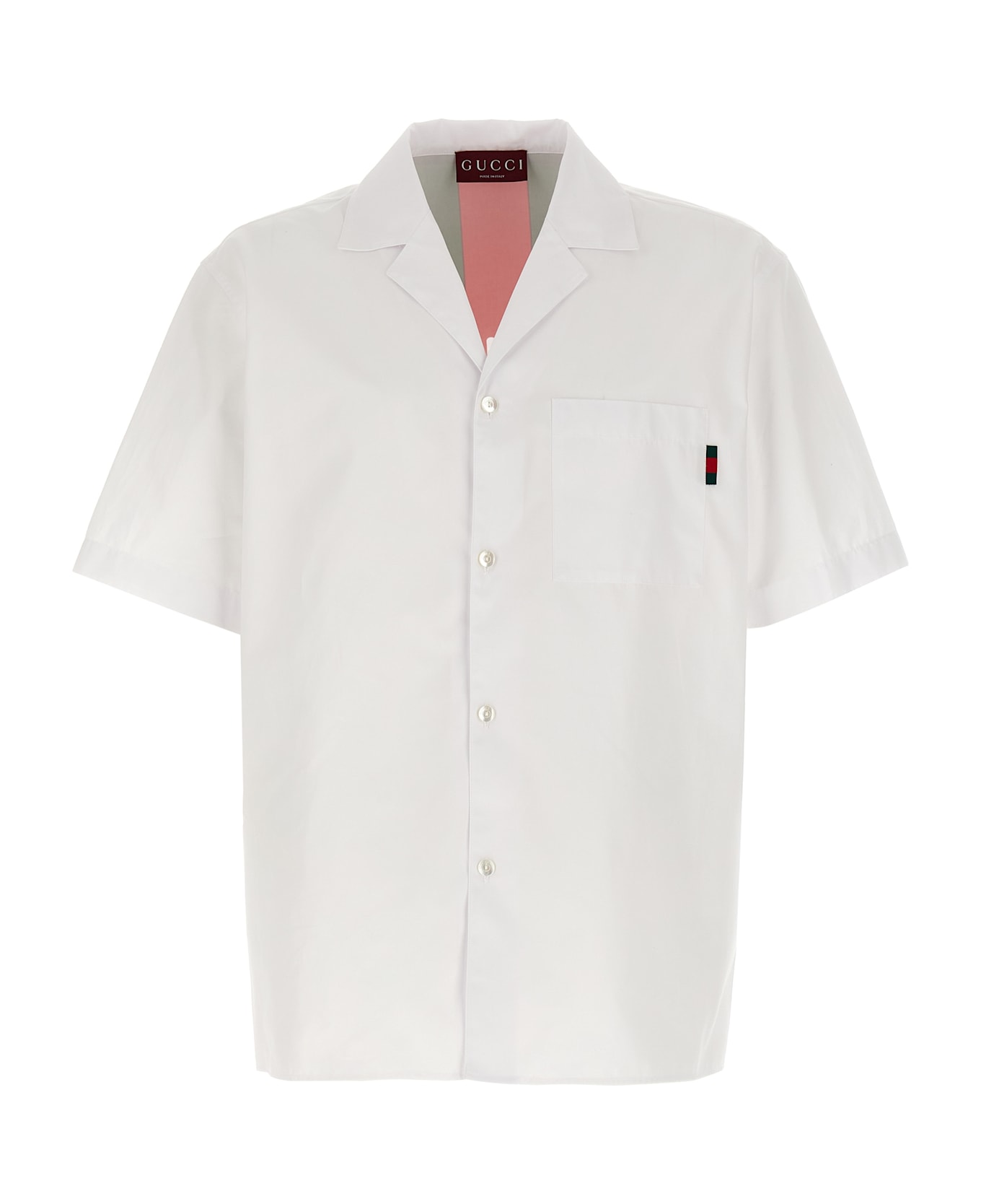 Cotton poplin shirt, back Web ribbon print, bowling style, V-neck, front button closure, breast pocket, short sleeves with dropped shoulders, side slits. Composition: 100% cotton