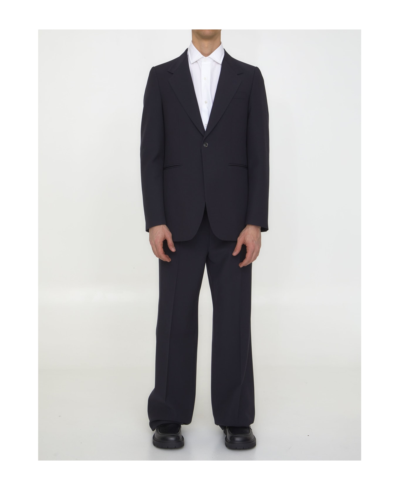 Two-piece suit in blue wool blend. Single-breasted jacket with classic lapels, single-button front closure, two front welt pockets, one welt pocket on chest and four seams detailing at the back. Oversized pleated trousers with zip, button and hook-and-eye closure, two side welt pockets and two rear welt pockets.