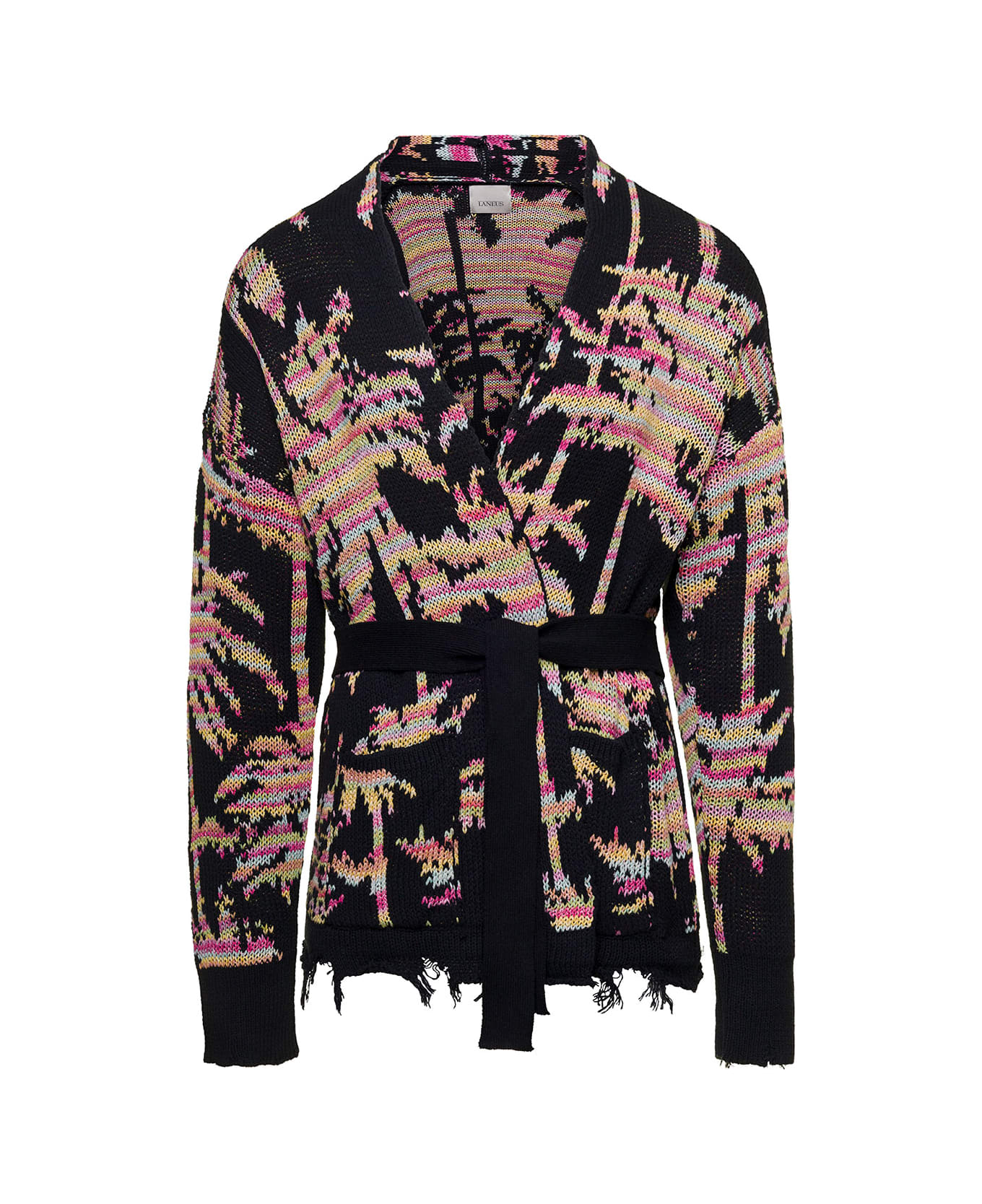 Black Belted Cardigan With Palm Jacquard Motif All-over In Cotton Man