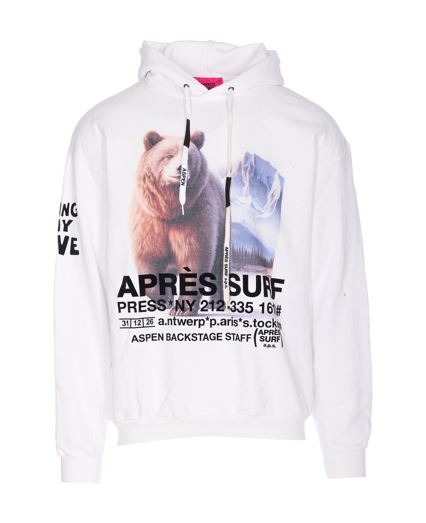 Apres Surf white hoodie, print logo on the front, hood with logo and coulisse, print on the back, print on sleeves