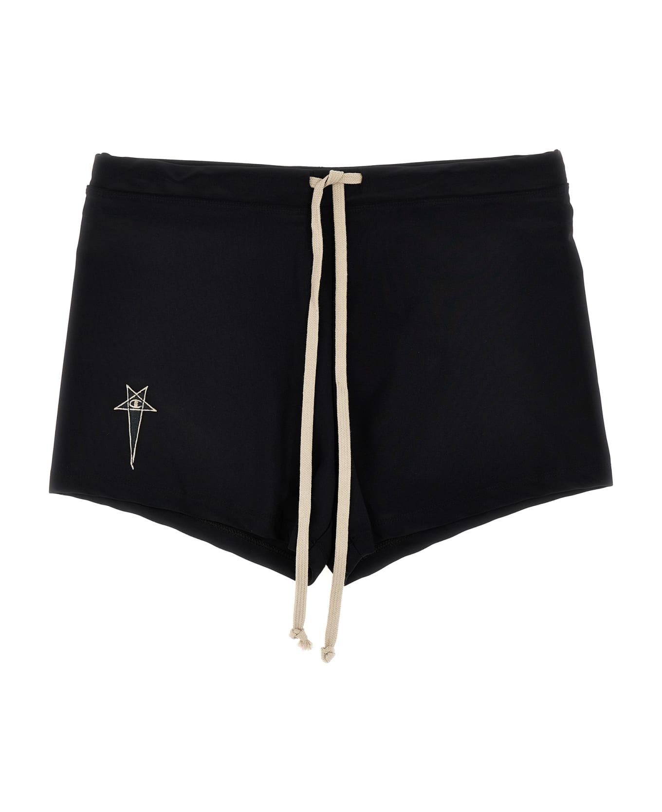 Champion x Rick Owens swimsuit with drawstring at the waist, and embroidered logo.