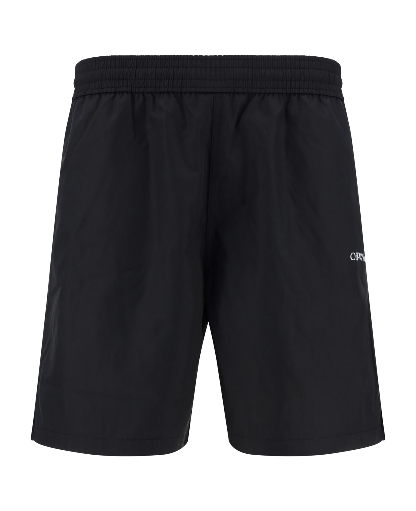 Swimshorts by off-white, elasticated waistband with drawstring, two side welt pockets, patch pocket on back, iconic brand logo printed in contrast on back pocket, brand signature in contrast on front.
