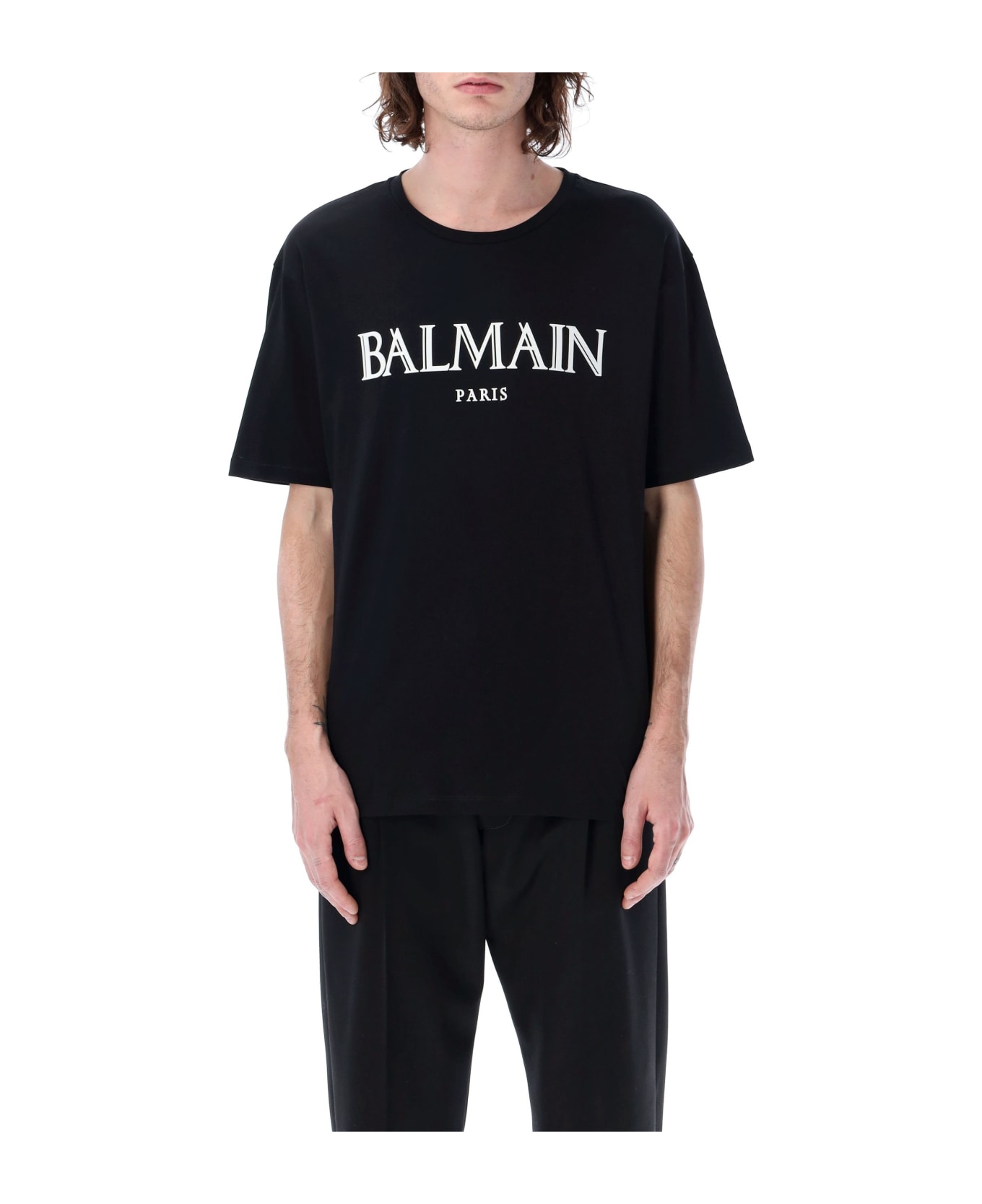 Cotton Logo T-shirt By Balmain. Featuring: Crew Neck Short Sleeves Rubber Roman Balmain Paris Logo At Front Classic Fit The Model Is 1,90 M Tall And He's Wearing Size L