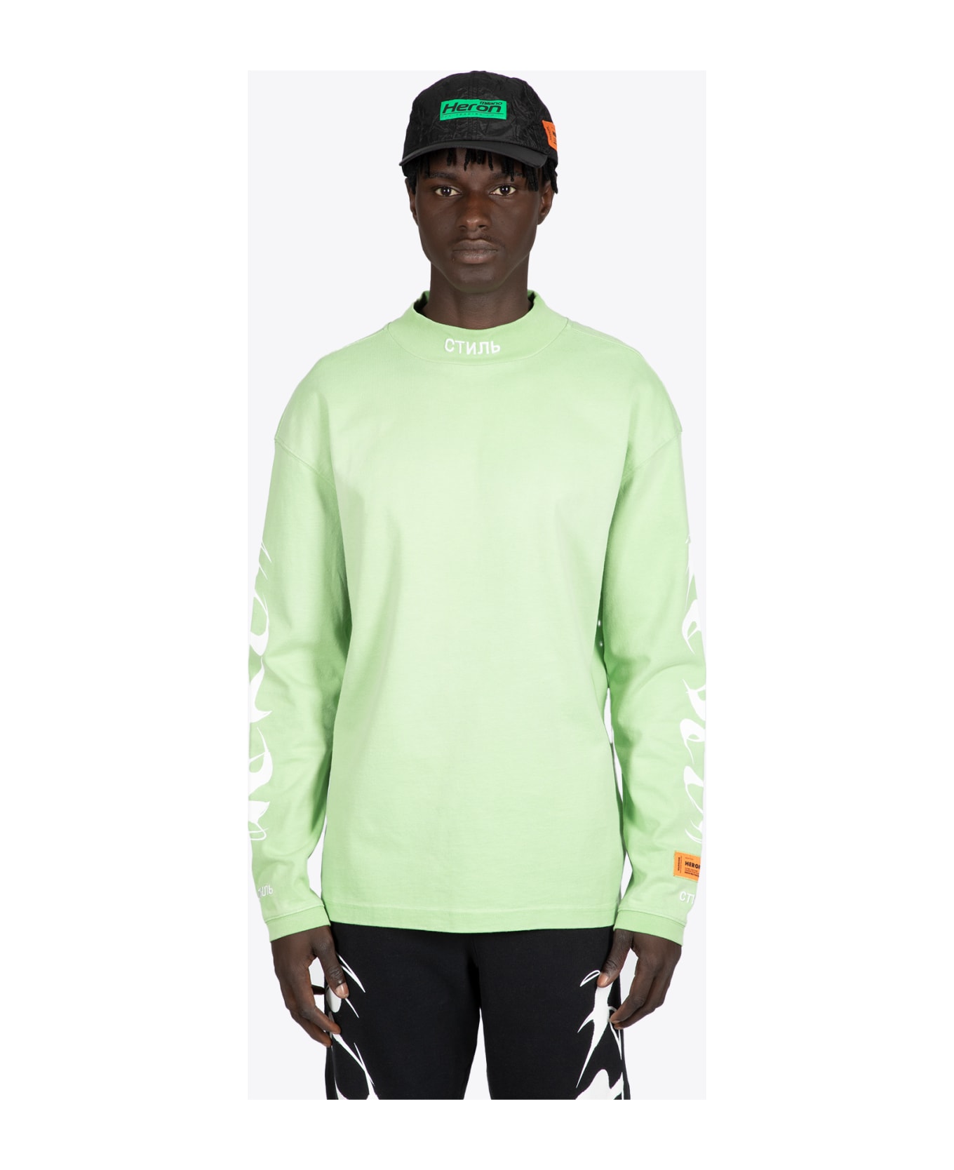 Apple green cotton t-shirt with ribbed mockneck and CTNMB embroidery, long sleeves with ribbed cuffs and logo print, regular fit. The model is 185 cm and wears size M. Composition: 100% cotton. Made in Portugal.