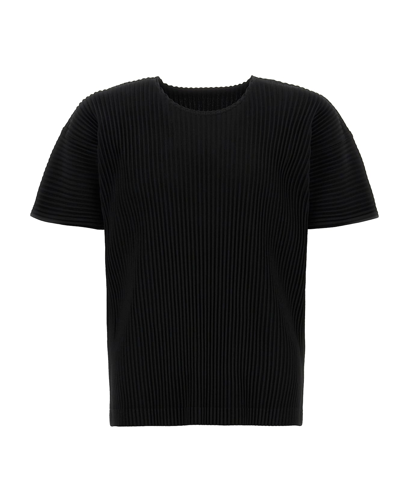 Pleated T-shirt, crew neck, and short sleeves.