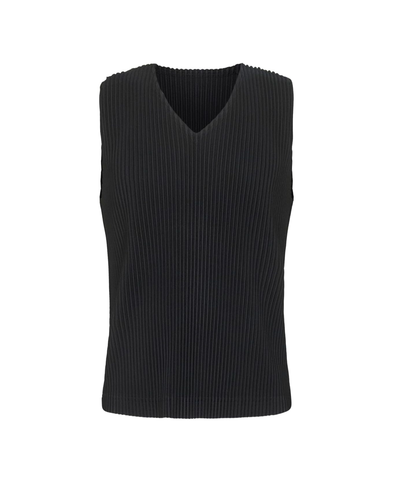 black V-neckline sleeveless straight hem pleated design