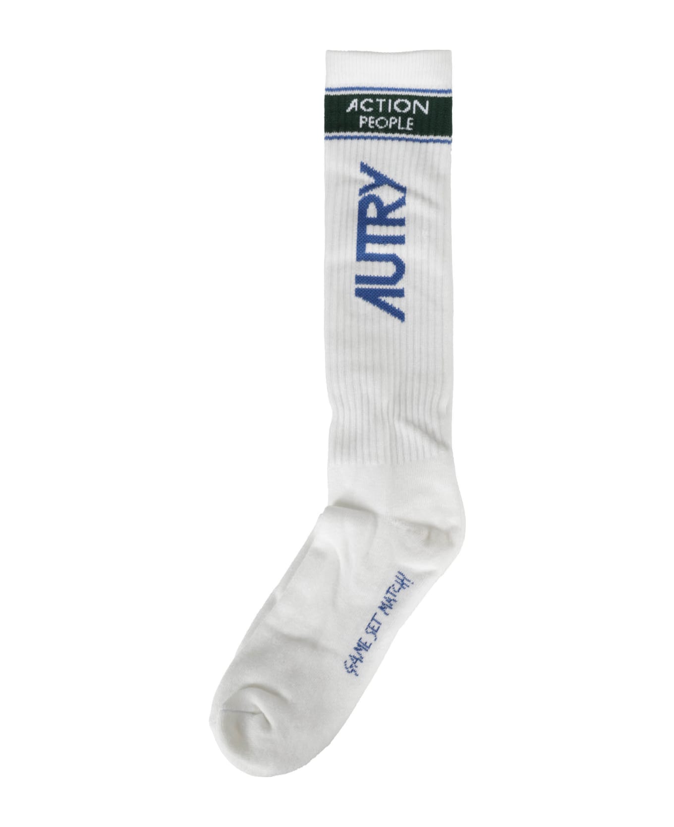 Sporty socks by Autry, white color, contrasting green and blue details.