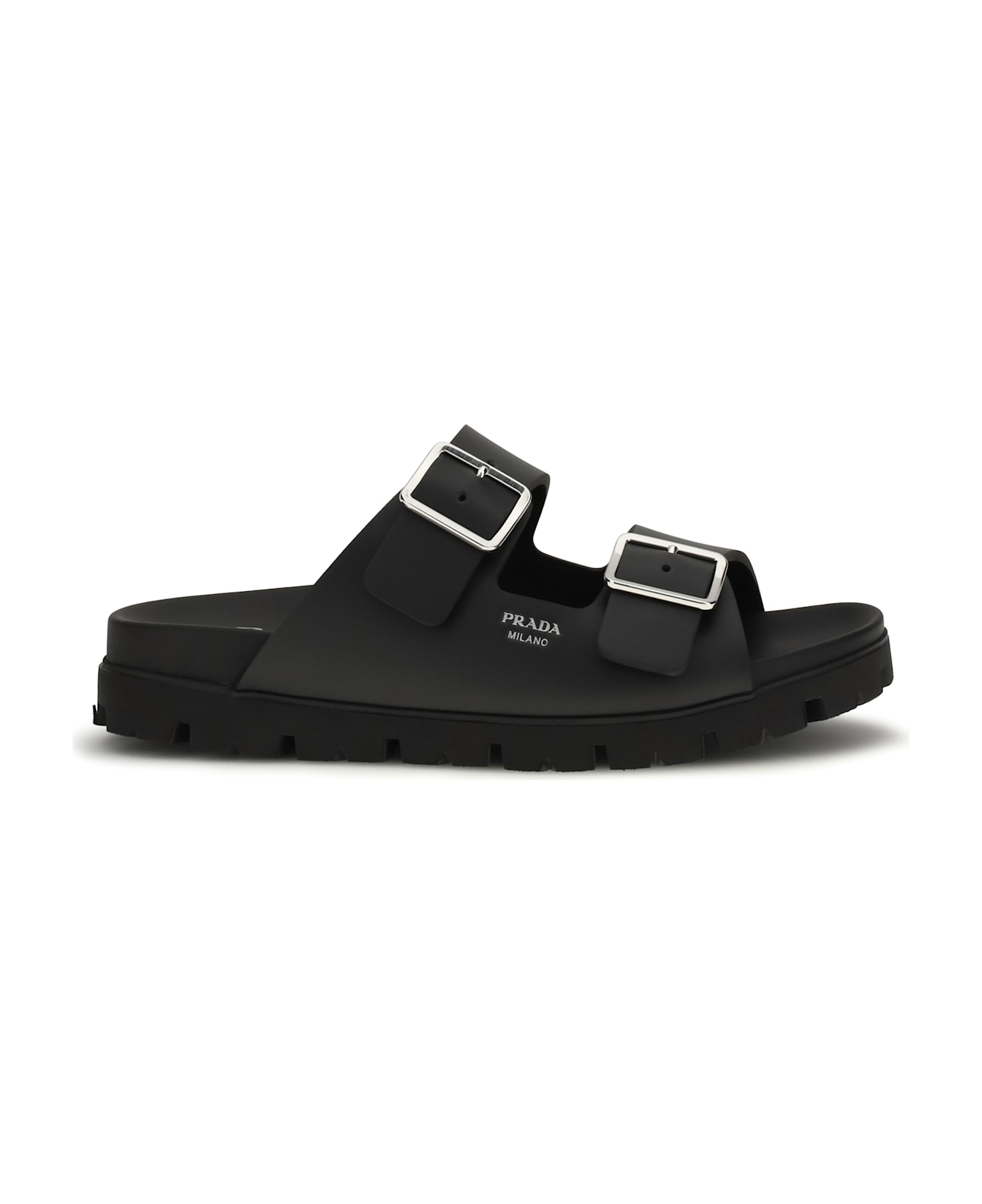 The leather sandals by prada stand out for their minimalist, contemporary design. crafted from smooth leather, they are embellished with a laminated logo print on the side that adds a bright, distinctive detail. the round toe ensures comfort, while the adjustable straps across the instep allow for a personalized fit. the printed logo on the inside completes the model with an iconic and refined touch, perfect for an elegant and modern summer look.