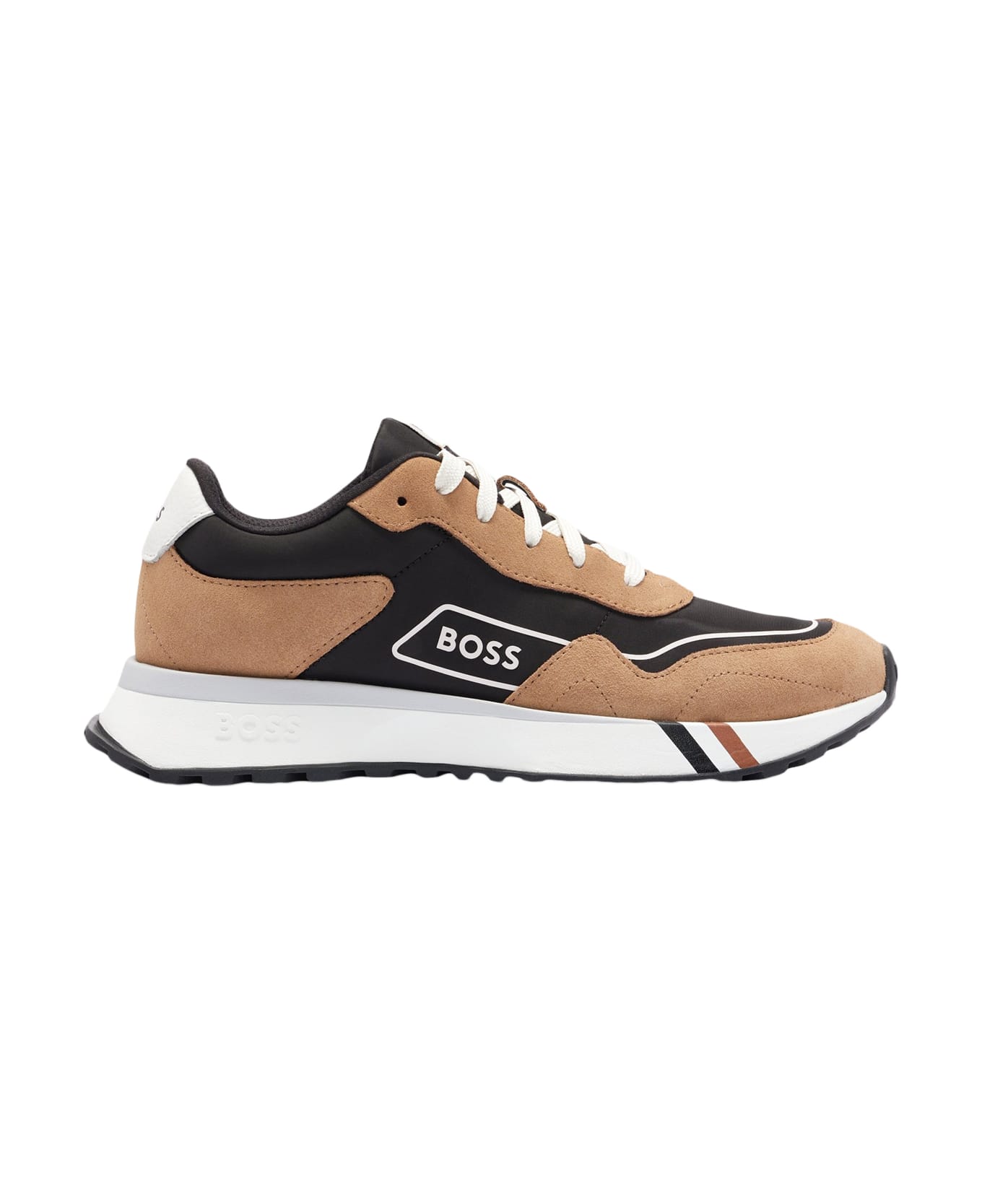 Light brown BOSS sneakers made from a mix of materials with suede leather detailing Model featuring a lace-up fastening, a fully lined design and the brand's signature logos and stripes on the sole.