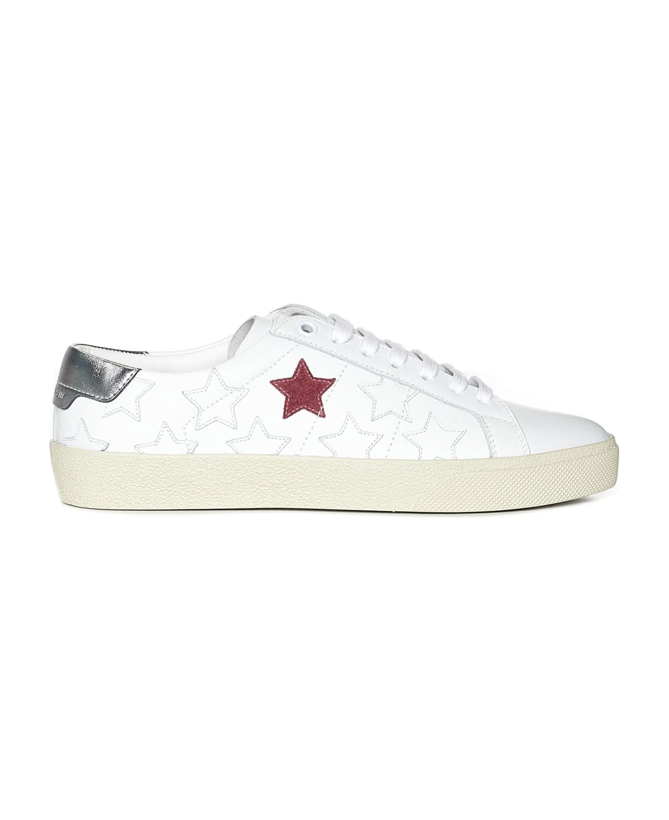 Ready to become the layer of your infinite looks, the California Court Classic SL/06 Sneakers by Saint Laurent combine easy style and iconic charm. Supported by the flat sole in ecru rubber, they are characterized by the round toe upper in white calfskin, on which the silver heel embellished with the embossed logo and the all-over applied stars shines, among which the red one on the outside stands out. Perfect to complete even the most basic styling with a touch of luxury.