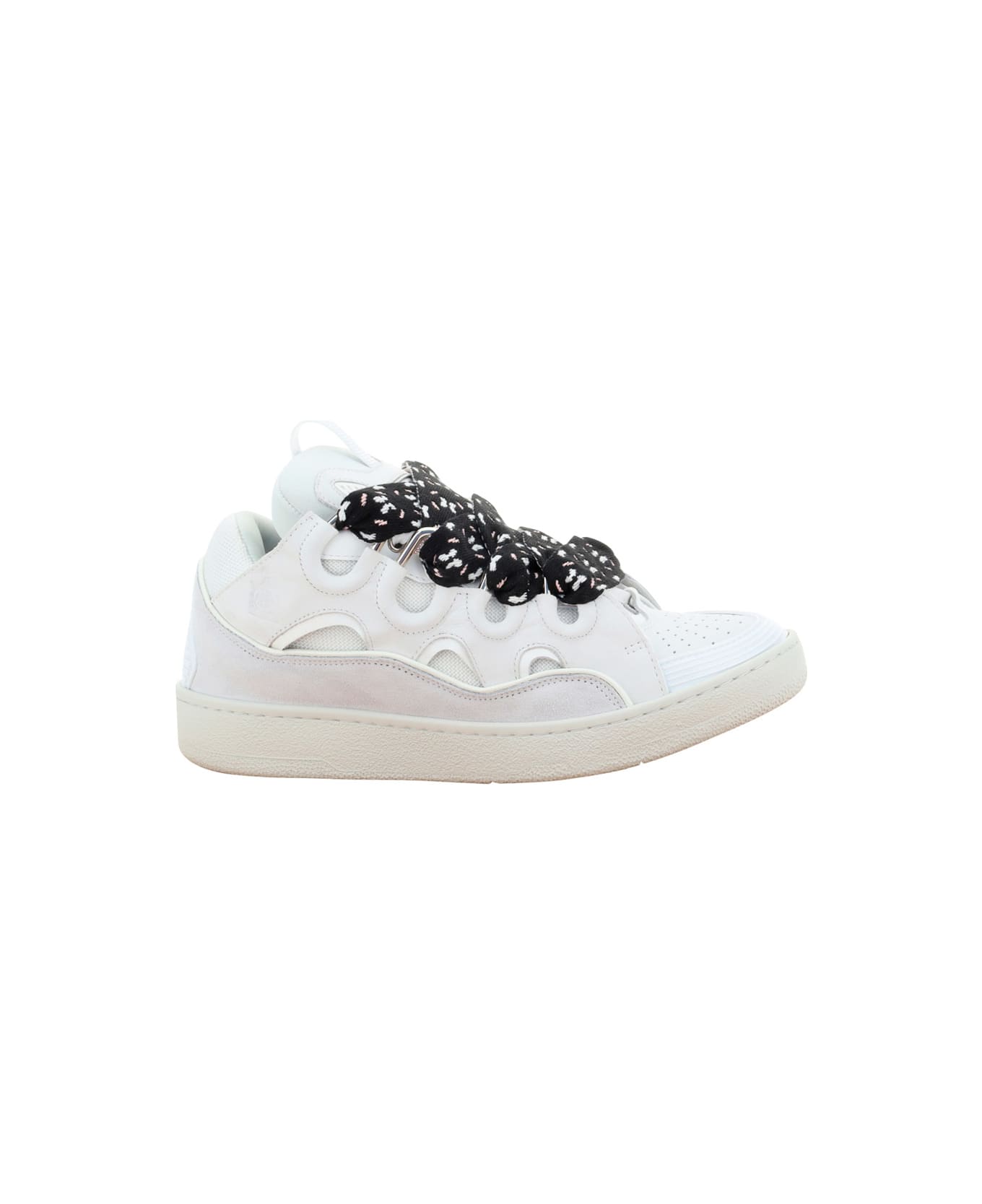 Calfskin curb sneakers by lanvin, rubber-reinforced and perforated round toe, padded tongue with iconic logo plaque, curved metal eyelets, paneled design, front closure with multicolored double laces, suede design, oversize design.