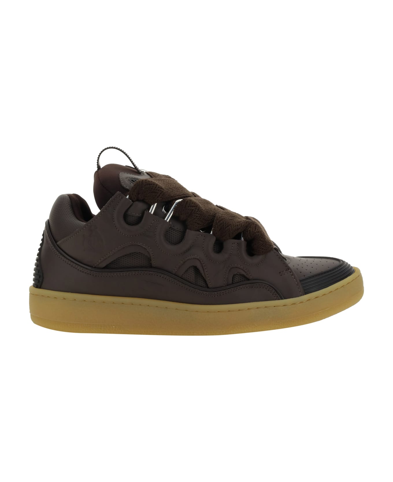 Calfskin curb sneakers by lanvin, round toe, a padded tongue with iconic logo plaque, curved metal eyelets, a panelled design, a thick double lace-up front fastening, a matte effect leather design, an oversized pattern and a contrasting sole.