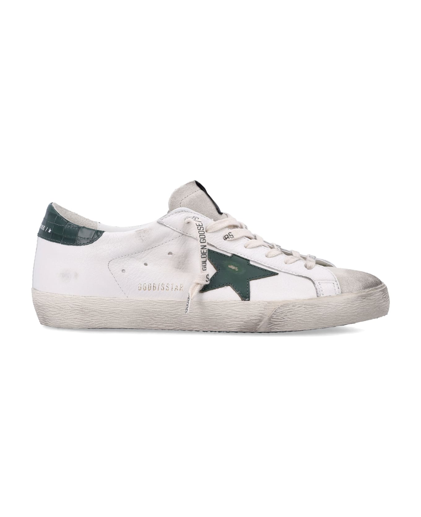 The Golden Goose Super Star Sneakers Embody A Refined Casual Attitude Through The Brand s Signature Lived-in Aesthetic. Crafted In White Leather, They Feature A Contrasting Green Star And Intentionally Distressed Details That Make Each Pair Unique. A Contemporary Icon That Blends Italian Craftsmanship, Everyday Comfort And A Distinctive, Effortlessly Cool Identity. Leather Upper