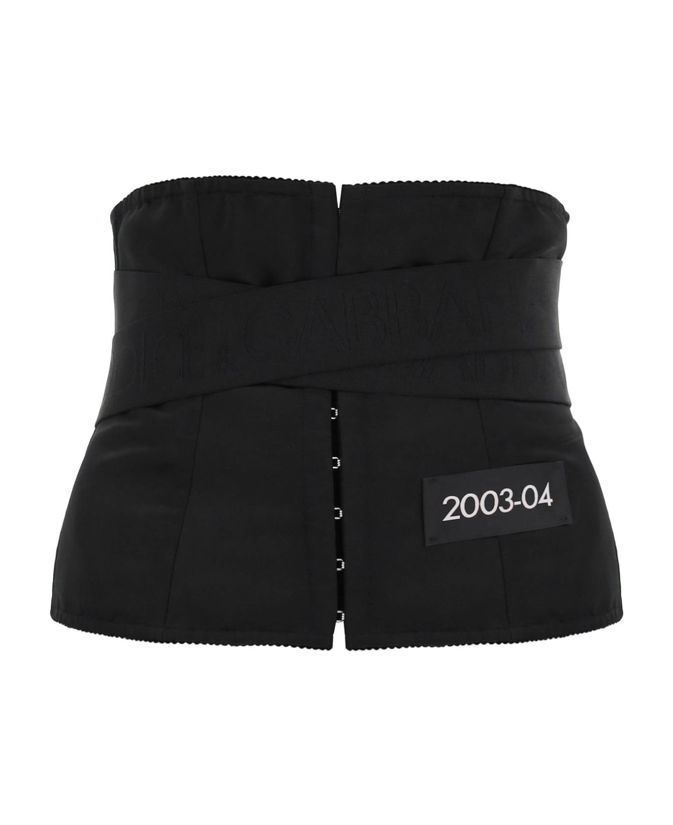 Dolce & Gabbana bustier crafted in satin on the front and in floral marquisette on the back, characterized by elastic logo bands with back velcro strap closure. It features front hook-and-eye fastening, scalloped edges and front archive label. The model is 177 cm tall and wears a size IT 42.