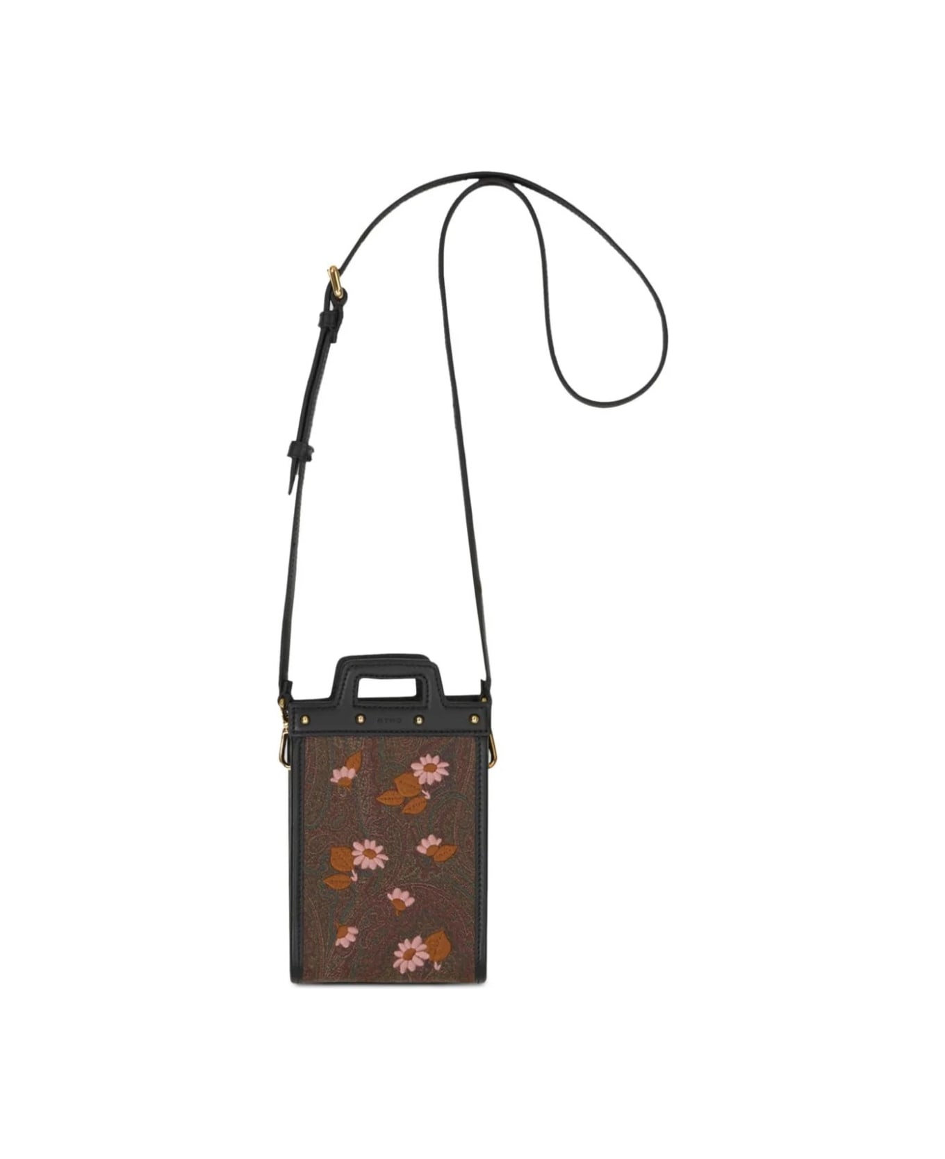 Black phone holder by Etro made of the iconic Paisley jacquard fabric and decorated with all-over floral embroidery. Adjustable and removable shoulder strap (50 cm). Finished with light gold-coloured metal accessories. Composition: Exterior: Paisley Fabric: Front: 76% Cotton, 24% Polyester;back: 100% Cotton. Coating: Pvc. Details: 100% Calf Leather. Embroidery: 100% Polyester. Lining: 100% Polyester.