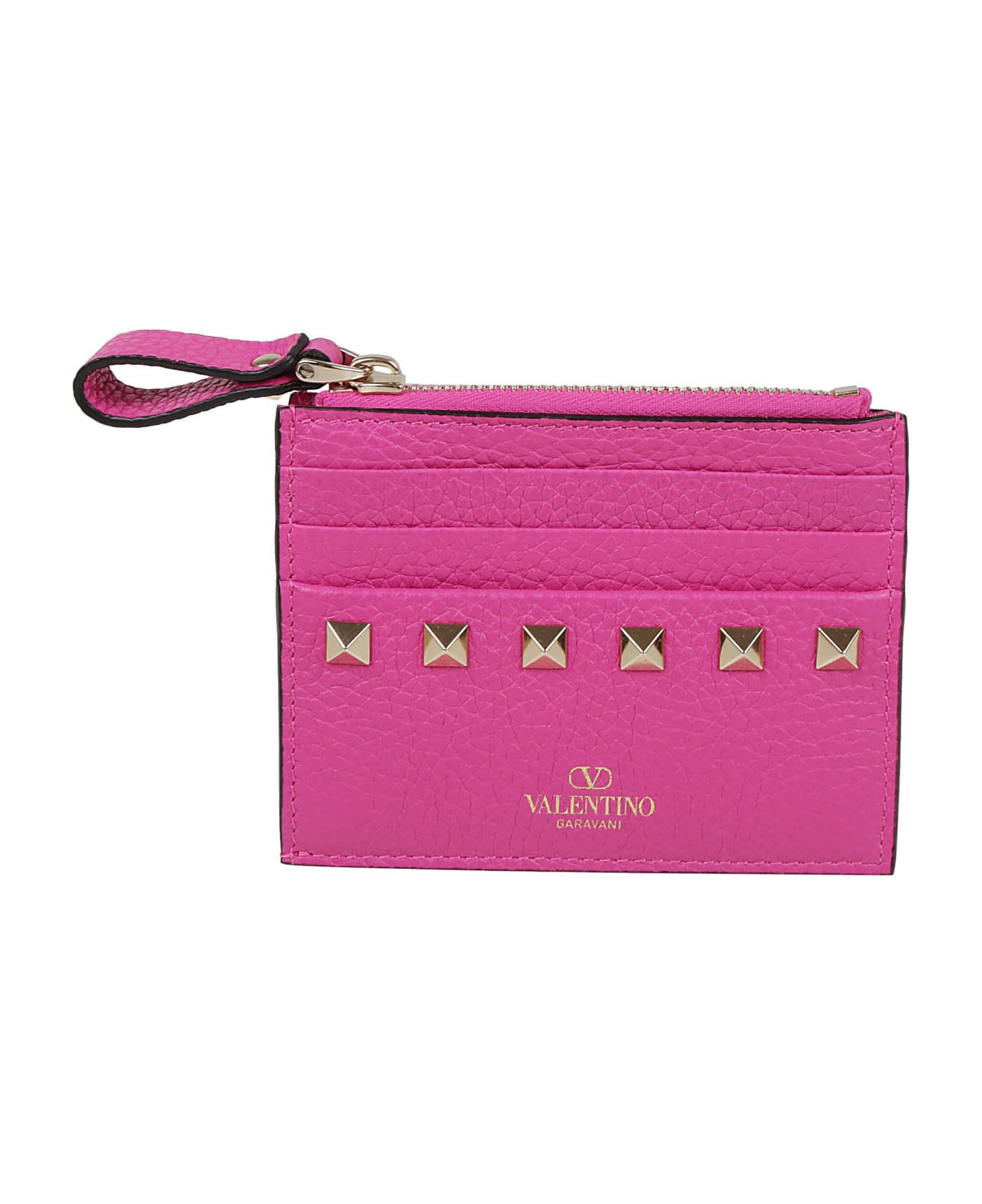 Rockstud coin and card purse in grained calfskin BY VALENTINO GARAVANI. Gusseted coin compartment with zip closure; six card slots. Embellished with antiqued brass colored studs.