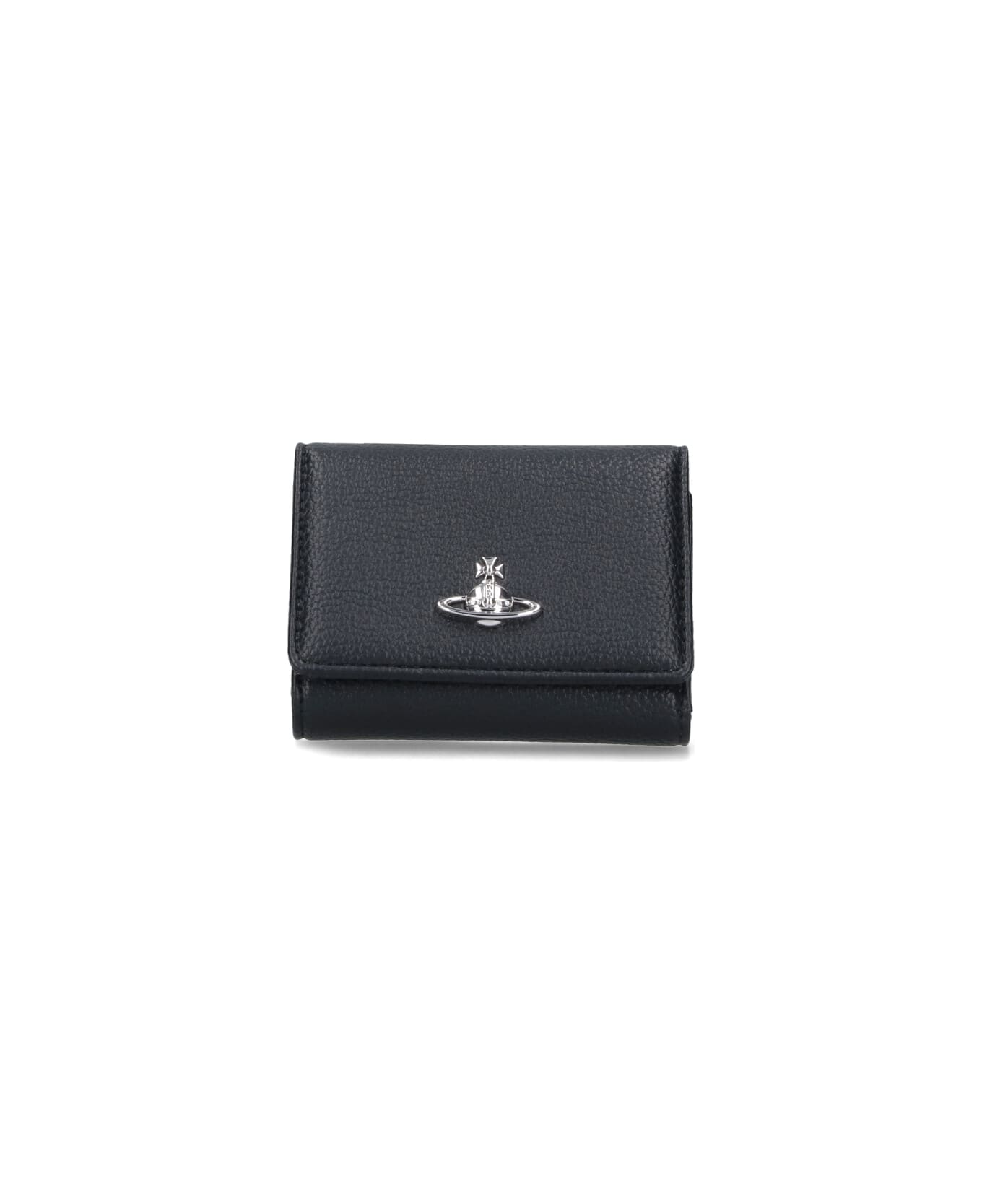 Vivienne Westwood 'orb' tri-fold wallet in black fabric with front button closure, silver metal 'orb' logo on the front, snap coin pocket, six inner card slots, bill compartment.