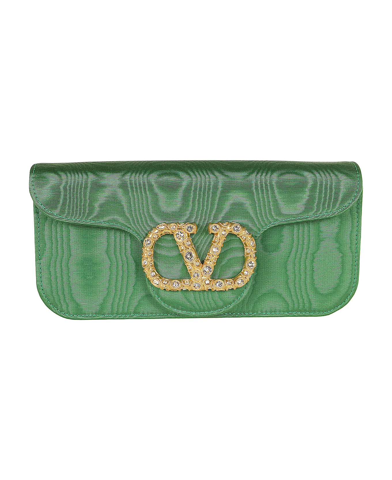 Locò clutch in moiré fabric by VALENTINO GARAVANI. Moiré fabric lining, interior: one flat pocket; magnetic closure; can be worn on the shoulder/cross-body thanks to the fabric shoulder strap (adjustable and removable) and the chain (removable); antique brass finish metal parts. Features a VLogo Signature jewel decorated with Swarovski®.