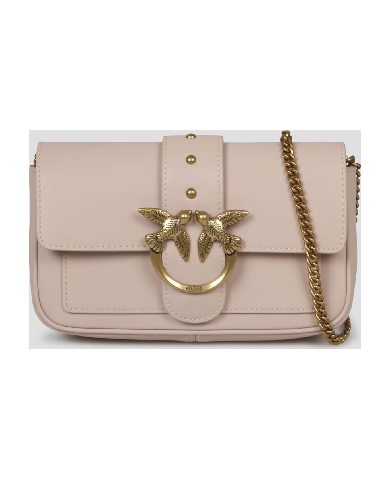 Pinko Pocket Love Bag One in silky-feel leather embellished with studded strap and a Love Birds Diamond Cut buckle. - SS23 - W:20cm H:12cm D:4cm - Removable chain shoulder strap - Extenal flap pocket on the back - Magnetic closure - Inside: 1 slip pocket, 1 main compartment, 1 zip pocket, 2 card slots - Finishes in antiqued gold metal - Made in China - 100% Calf leather