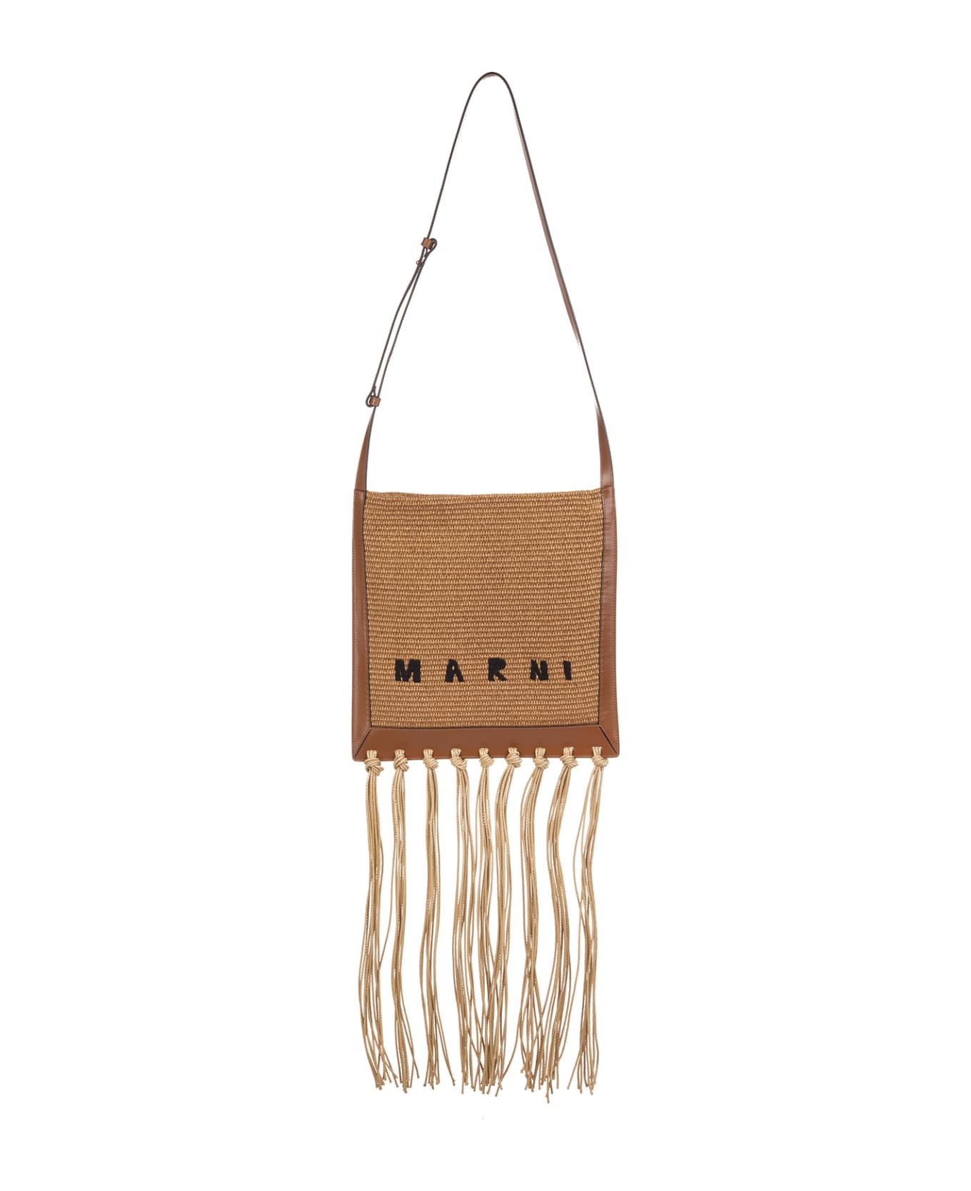 Brown raffia/leather logo embroidered fringe crossbody bag from MARNI featuring single shoulder strap, tonal stitching, top zip fastening, full lining, internal zip pocket and internal logo patch. Composition: 100% Raffia