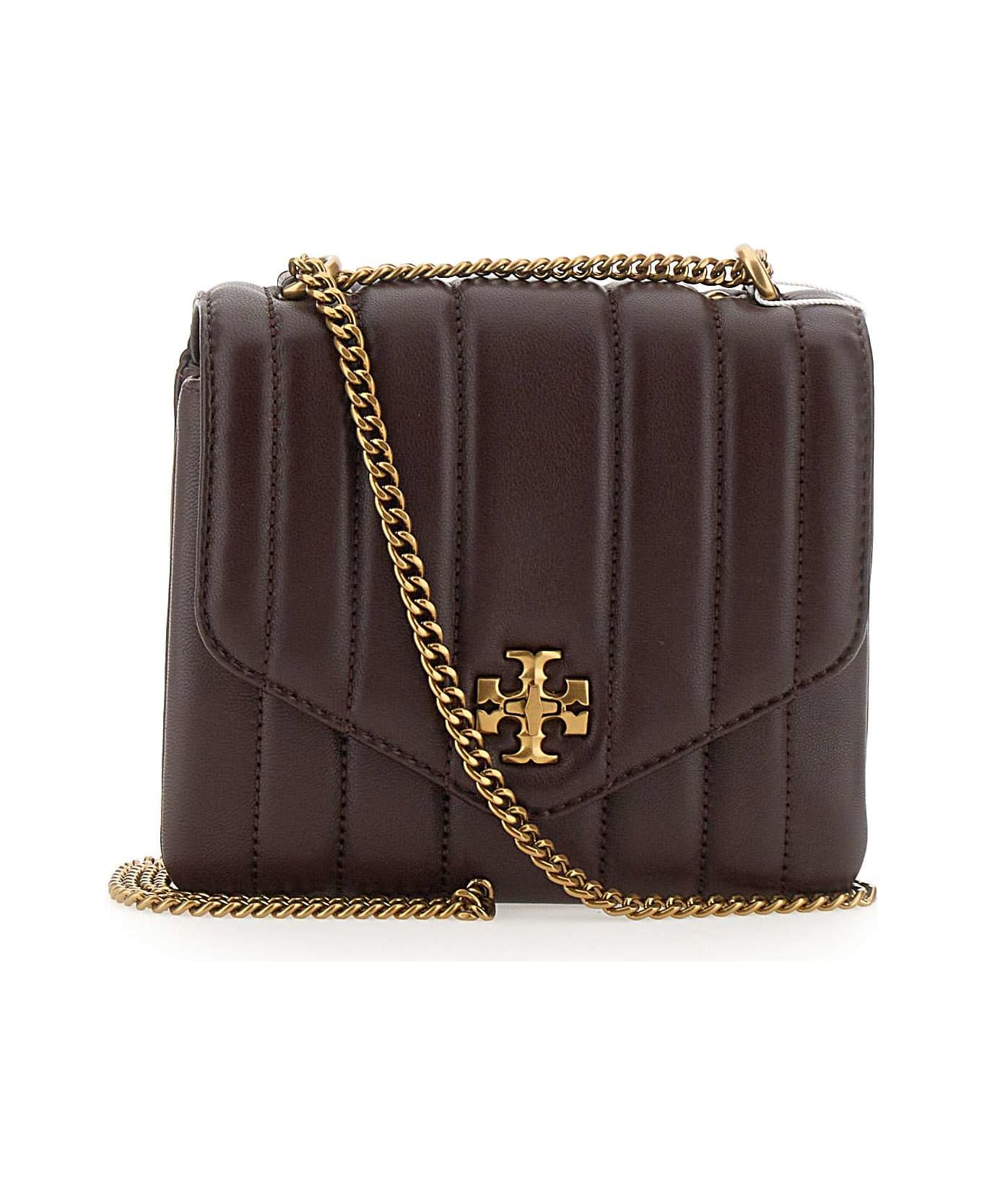 Tory Burch woman shoulder bag "'Kira Square Crossbody' leather, dark brown, quilted, fastening and logo in gold front metal, gold chain shoulder strap, two internal compartments, one of which is central with zip, internal compartments for cards. Dimensions : length 18cm, height 15cm, depth 5cm