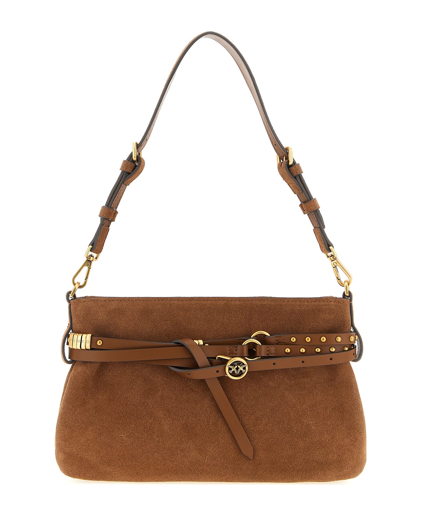 Small suede shoulder bag Belt Mini with flat design, slightly trapezoid silhouette, adjustable multi-turn matching belt with metal studs and 'Love Birds' buckle, top zip closure, adjustable and removable handle, cotton drill lining, adjustable and removable shoulder strap.