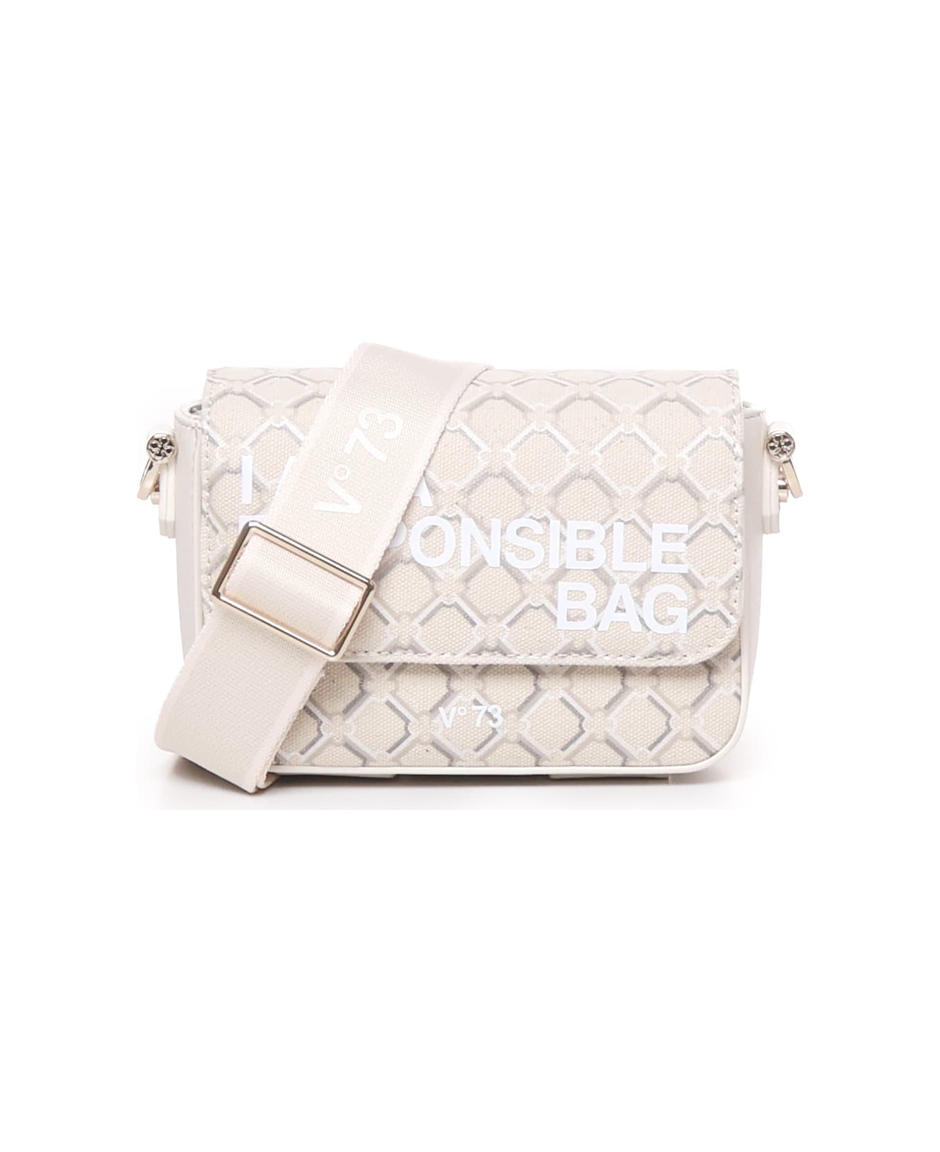 -Dimensions: 11x6x17 cm -Adjustable shoulder strap -Flap closure -Front slogan -Colour: offwhite