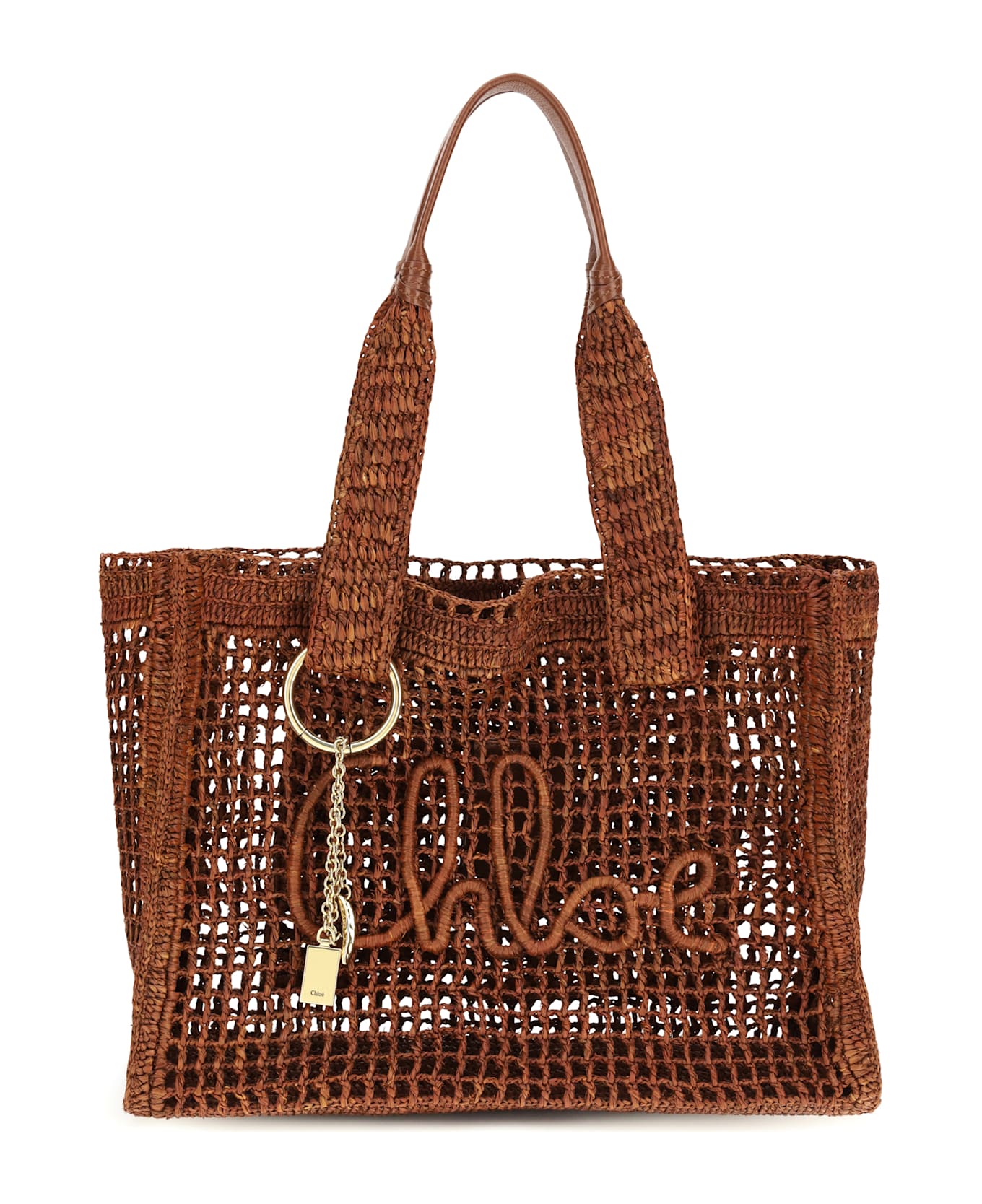 The east-west summer banana raffia tote bag by chloé is handcrafted from crocheted raffia and buffalo leather, featuring the chloé signature in cursive lettering on the front as a nod to the maison's heritage. finished with a dangling chain and decorative charms, it features a spacious main compartment and an interior pocket, combining artisanal elegance, functionality, and distinctive summer style.
