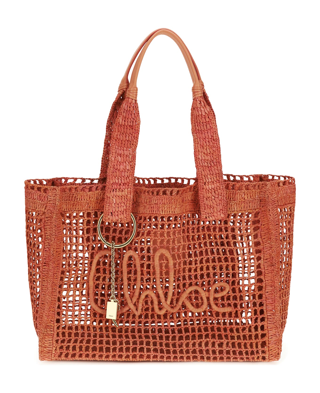 The east-west summer banana raffia tote bag by chloé is handcrafted from crocheted raffia and buffalo leather, featuring the chloé signature in cursive lettering on the front as a nod to the maison's heritage. finished with a dangling chain and decorative charms, it features a spacious main compartment and an interior pocket, combining artisanal elegance, functionality, and distinctive summer style.