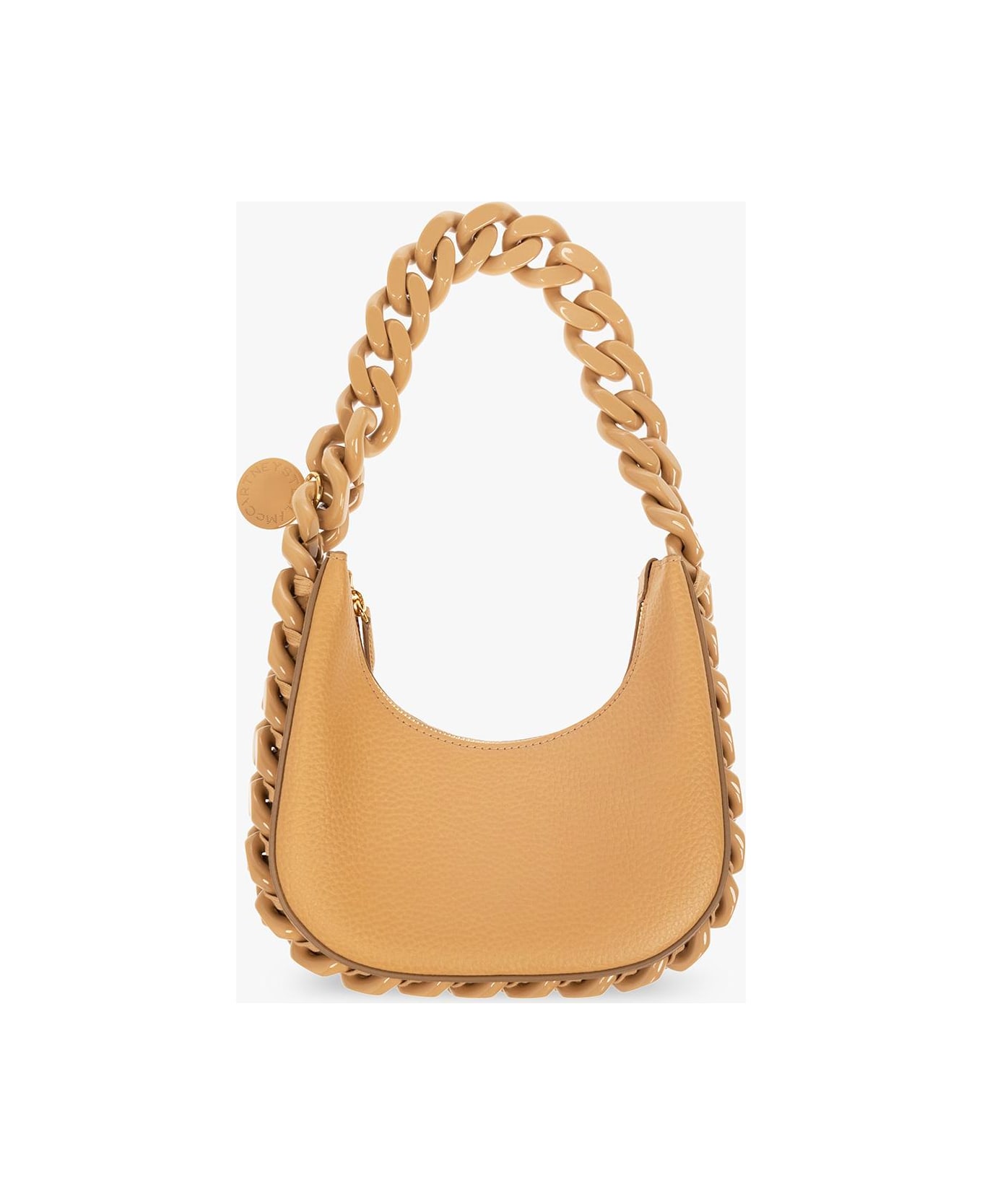 Beige 'Frayme Mini' shoulder bag from Stella McCartney. Fastened with a zip, this design features chain details in beige with logo charms, gold-tone metal hardware and one internal compartment with one card slot. Composition: Outer Layer: 67% Polyurethane 33% Polyamide
