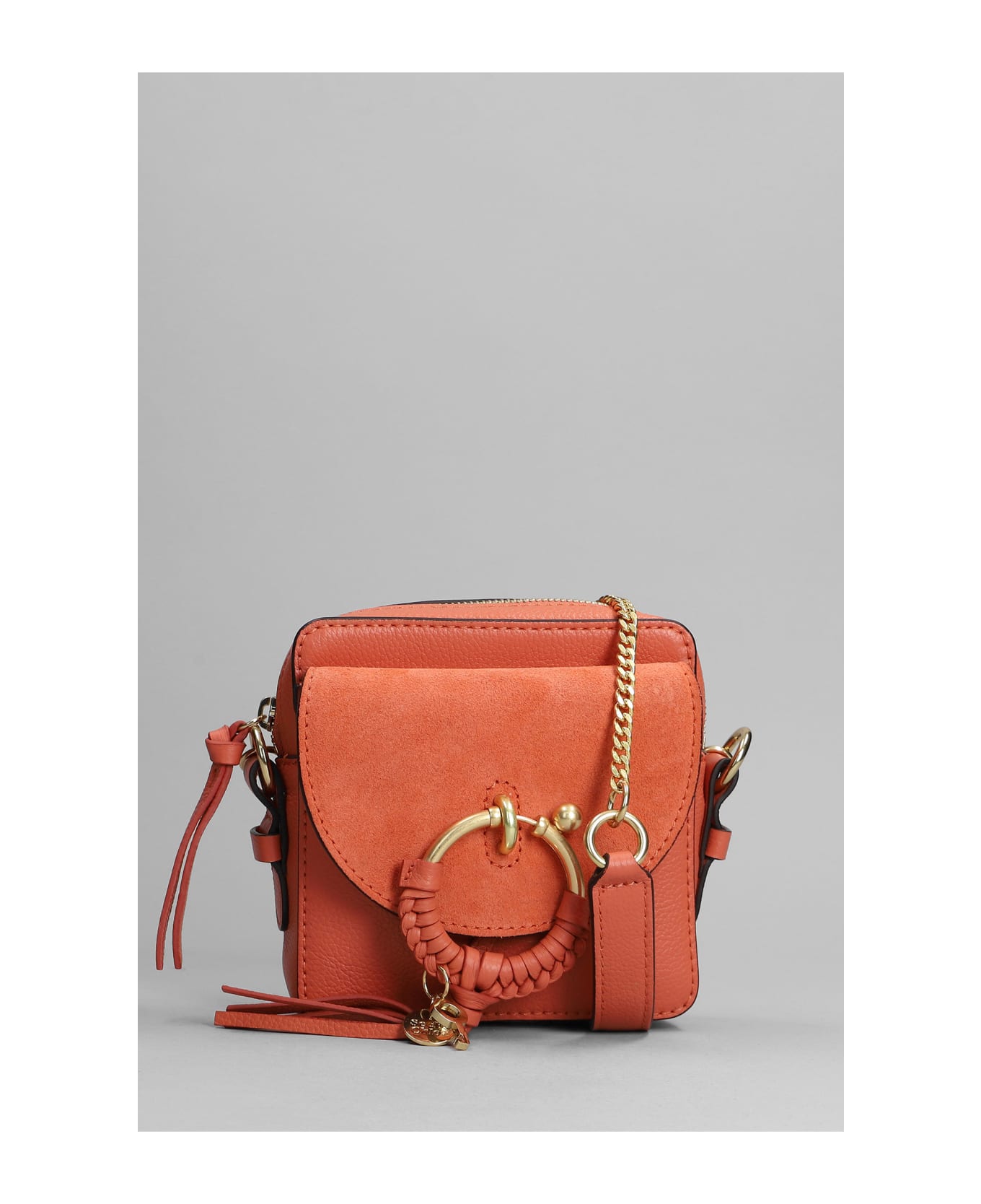 Joan Shoulder bag in orange suede and leather, Height 150 mm, Width 140 mm, chain and leather carry, front flap pocket, iconic ring with braided leather, zip clousure, suede details, 100% leather, Made in India