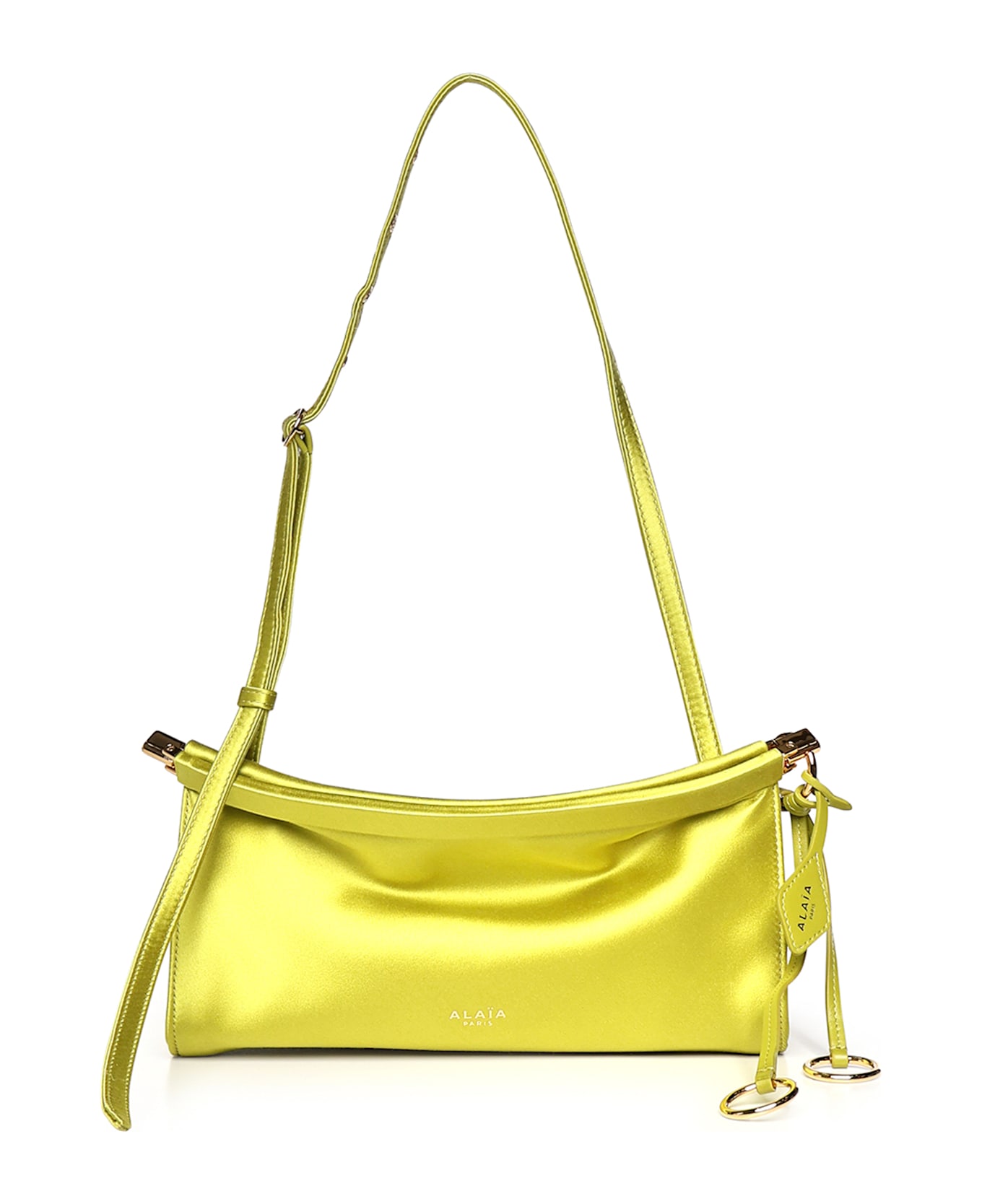 - Made of silk satin - Adjustable shoulder strap - Decorative ties with metal rings - Made in Italy - Dimensions: 25 x 12. 5 x 7 cm - Color: Lime