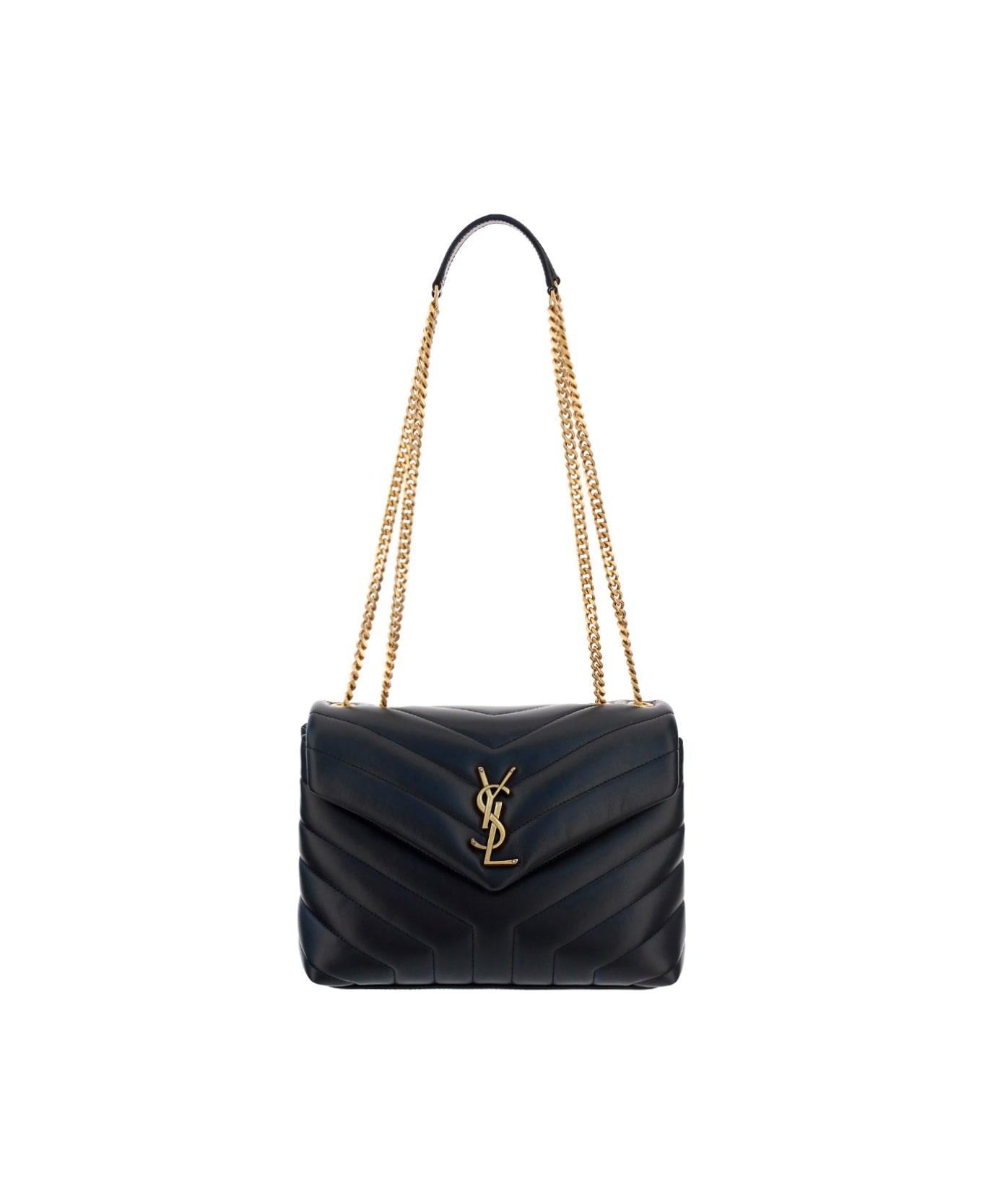 Calfskin loulou shoulder bag by saint laurent, sliding chain shoulder strap, press-stamped brand monogram on leather shoulder patch, quilted and padded design, press-stud front opening, iconic metallic brand logo embossed in contrasting color on front flap, double interior compartment, interior zippered pocket, interior welt pocket, press-stamped brand signature inside.