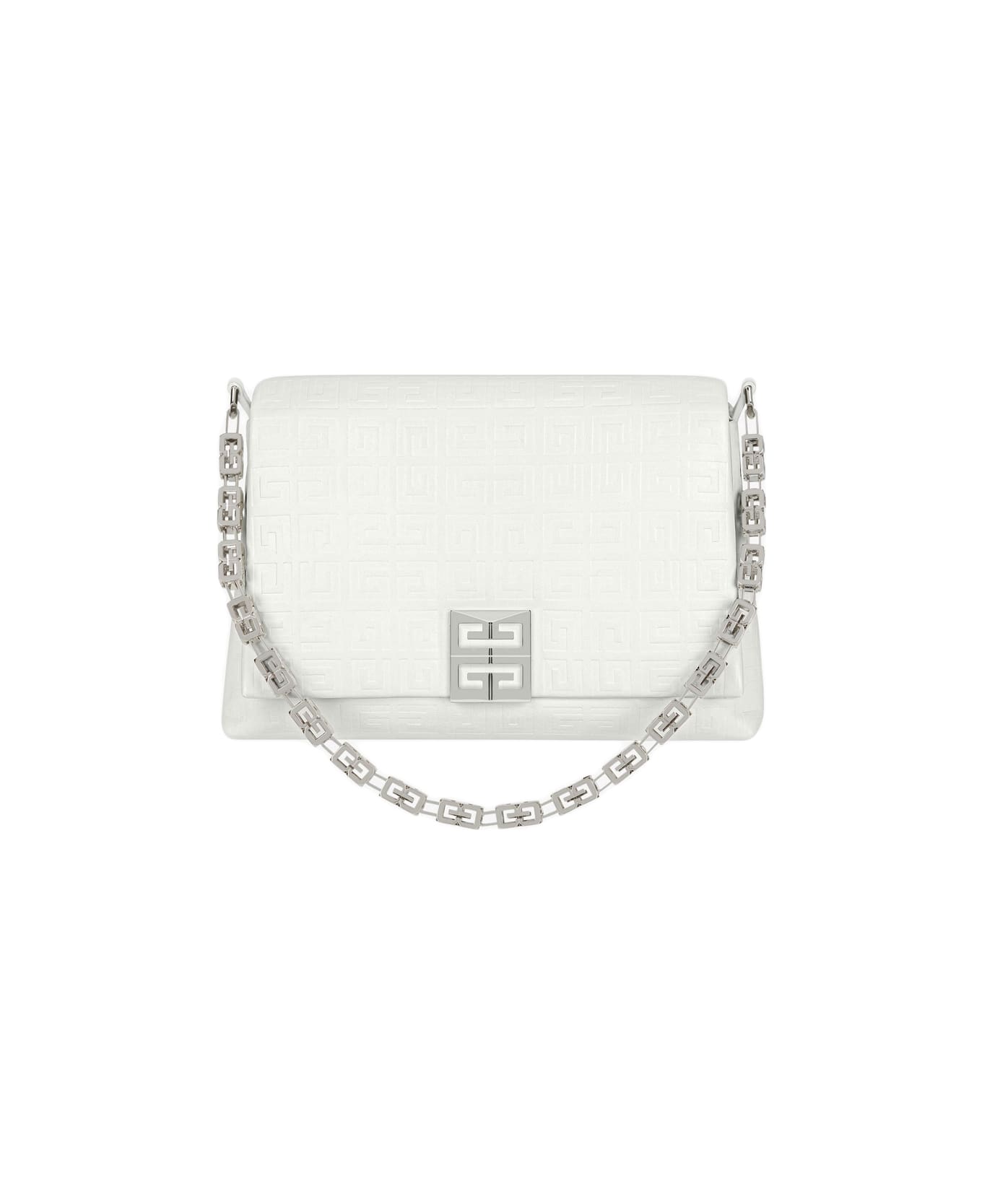 Medium 4G Soft shoulder bag by GIVENCHY made of embossed ivory calf leather with 4G motif. Featuring two main compartments, an interior zip pocket, a flat back pocket, silver-finish metal details, a flap with a metal magnetic 4G closure, a short 4G metal chain shoulder strap and a detachable long shoulder strap. smooth skin.