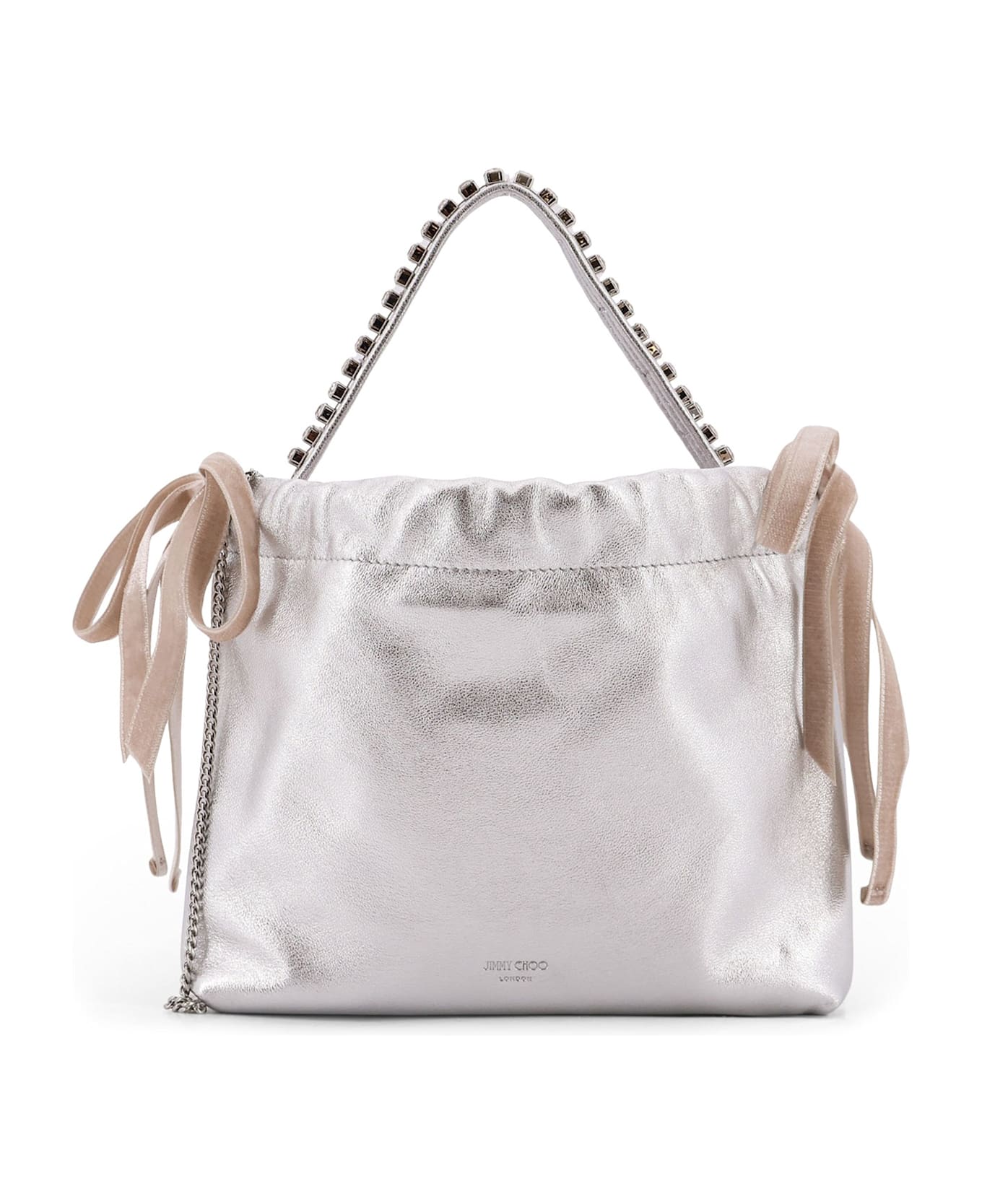 Leather handle with rhinestone detail Drawstring closure Removable and adjustable metal shoulder strap Lined Made in Italy Leather W: 22 cm, H: 18 cm, D: 2 cm SKU: DRAWSTRINGMINITHYZOSILVERROSESILVER
