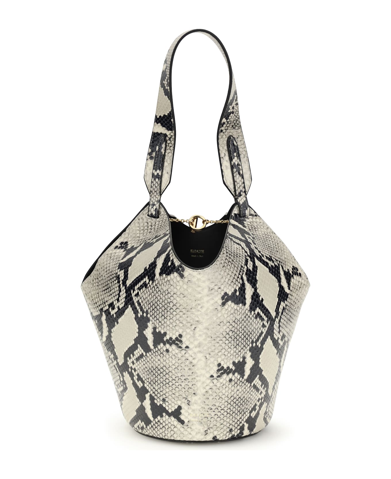 The mini lotus shoulder bag by khaite, inspired by a scarf, is crafted from python-embossed calfskin with multi-toned scales that enhance its elegance. lightweight and compact, it retains the original's petite yet elongated proportions and rounded base. the internal gold-tone chain closure and soft nappa lining complete the design, making it both refined and practical.