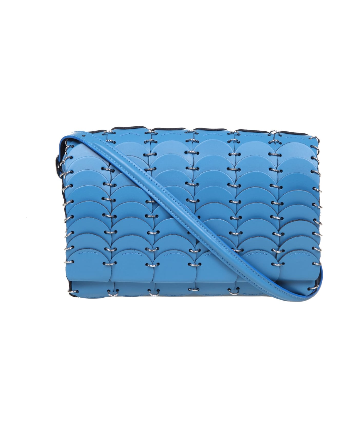 Shoulder bag in leather handmade bag with leather discs adjustable leather shoulder strap leather interior one external rear pocket one internal pocket with credit card holder navy blue color flap closure dimensions: length 23cm height 16cm depth 8cm