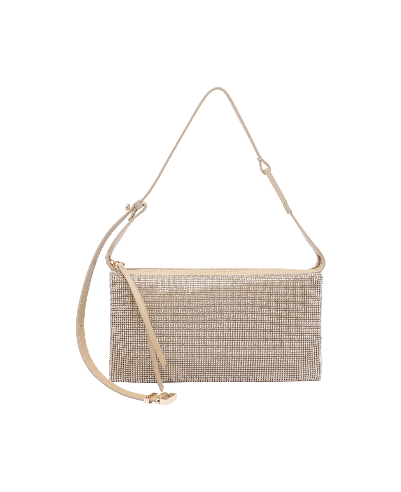 Bendetta Bruzziches gold Syster shoulder bag, 3 compartments, 2 flat open pockets, adjustable shoulder strap, all over strass details Composition: 100% Silk, 100% Strass