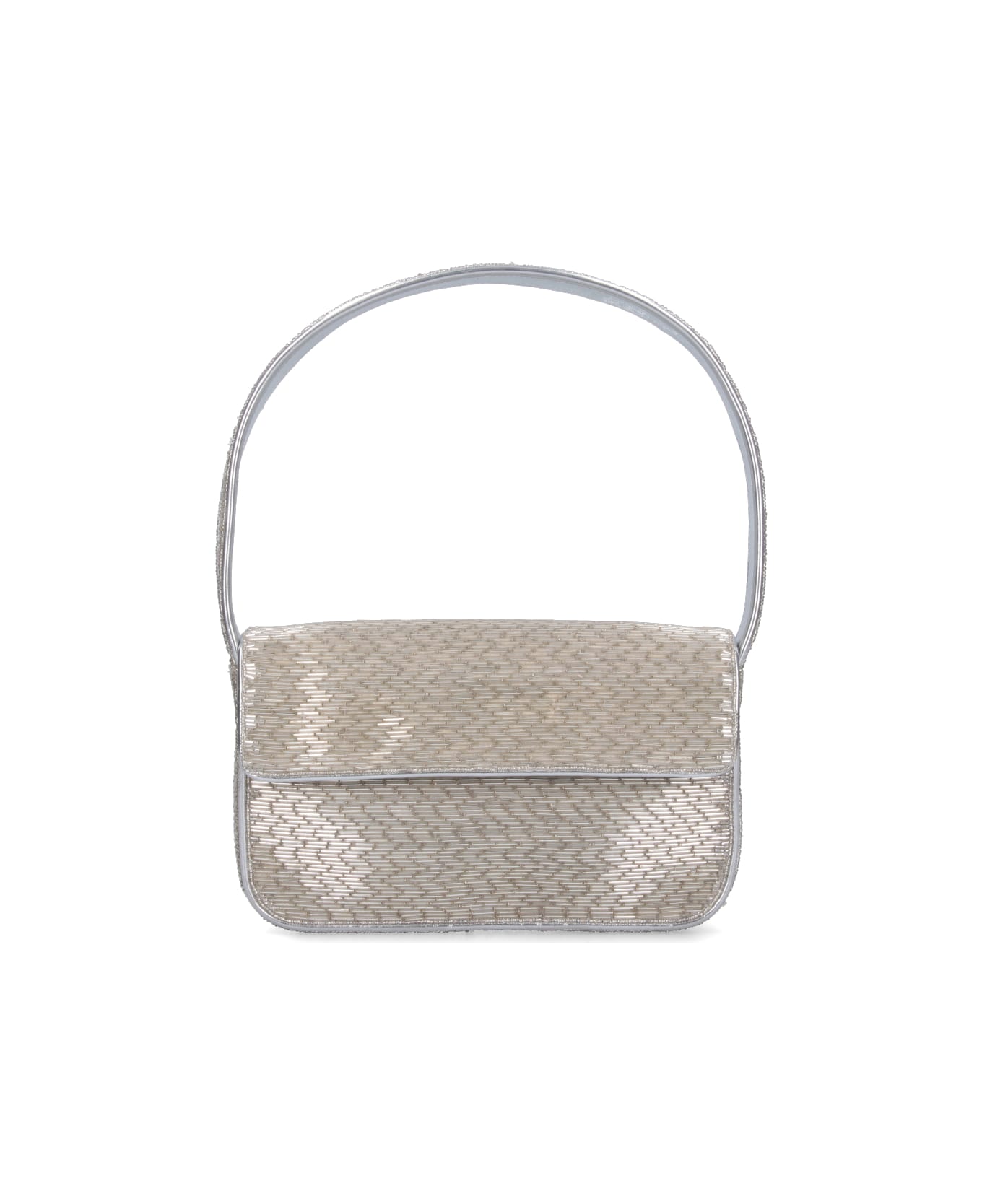 Staud shoulder bag with silver "Tommy" beads in silver faux leather with tone-on-tone beaded appliqué, all-over wavy pattern, rigid top handle, magnetic back slip pocket, black logo detail, magnetic button flap closure, main inner compartment, inner zip pocket, removable inner pouch, removable shoulder strap detail.