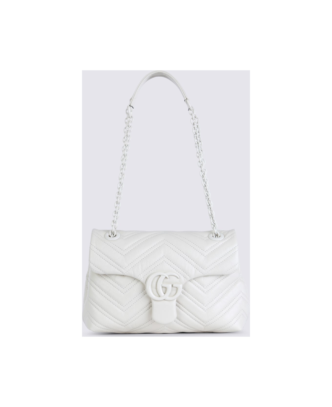 White leather Marmont shoulder bag from Gucci featuring white tone logo hardware, adjustable shoulder chain, main compartment and magnetic button closure. Composition: _, 100% Le