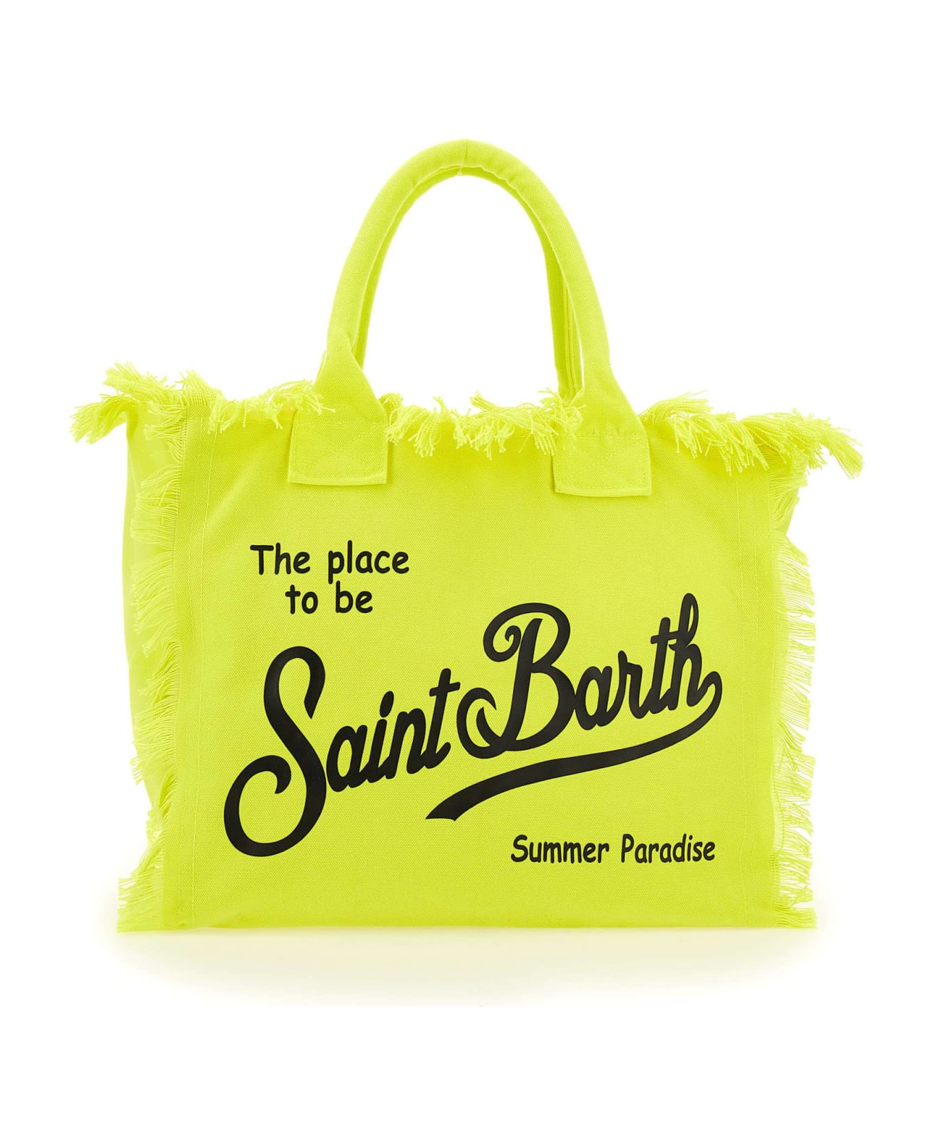 Mc2 Saint Barth "Vanity Summer Paradise" fabric handbag, fluo yellow, double top handle, fringe detail, top zip fadtening, single internal compartment, internal zip pocket, slip pocket with logo, cotton lining,maxi black logo print on front and back. Dimensions: length 40cm, depth 20cm, height 32cm.