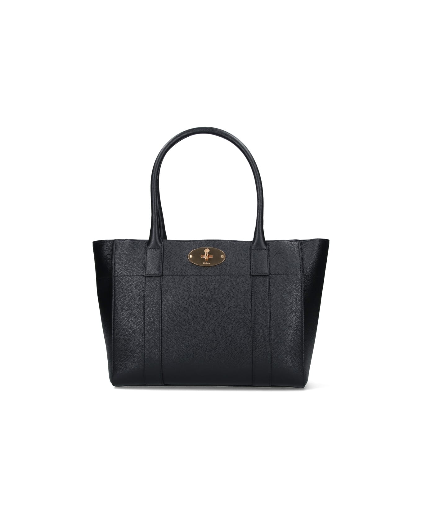 Mulberry 'Bayswater 9 to 5' bag in black hammered calf leather with two top handles, 'Postamn's lock' flap closure, engraved logo detail, inner slip pocket, main inner compartment.