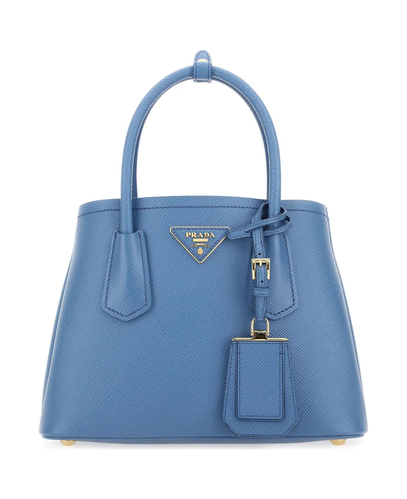 Handbag realized in Saffiano leather enriched by iconic logoed triangle at the front and detachable tonal leather accessory. - Two round tonal leather handles - Adjustable detachable tonal leather shoulder strap - Compression lateral buttons - Lined interior with a central slit pocket - Protective metal feet at the base Composition: Exterior: 100% Leather Lining: 100% Leather Finishing: Golden metal