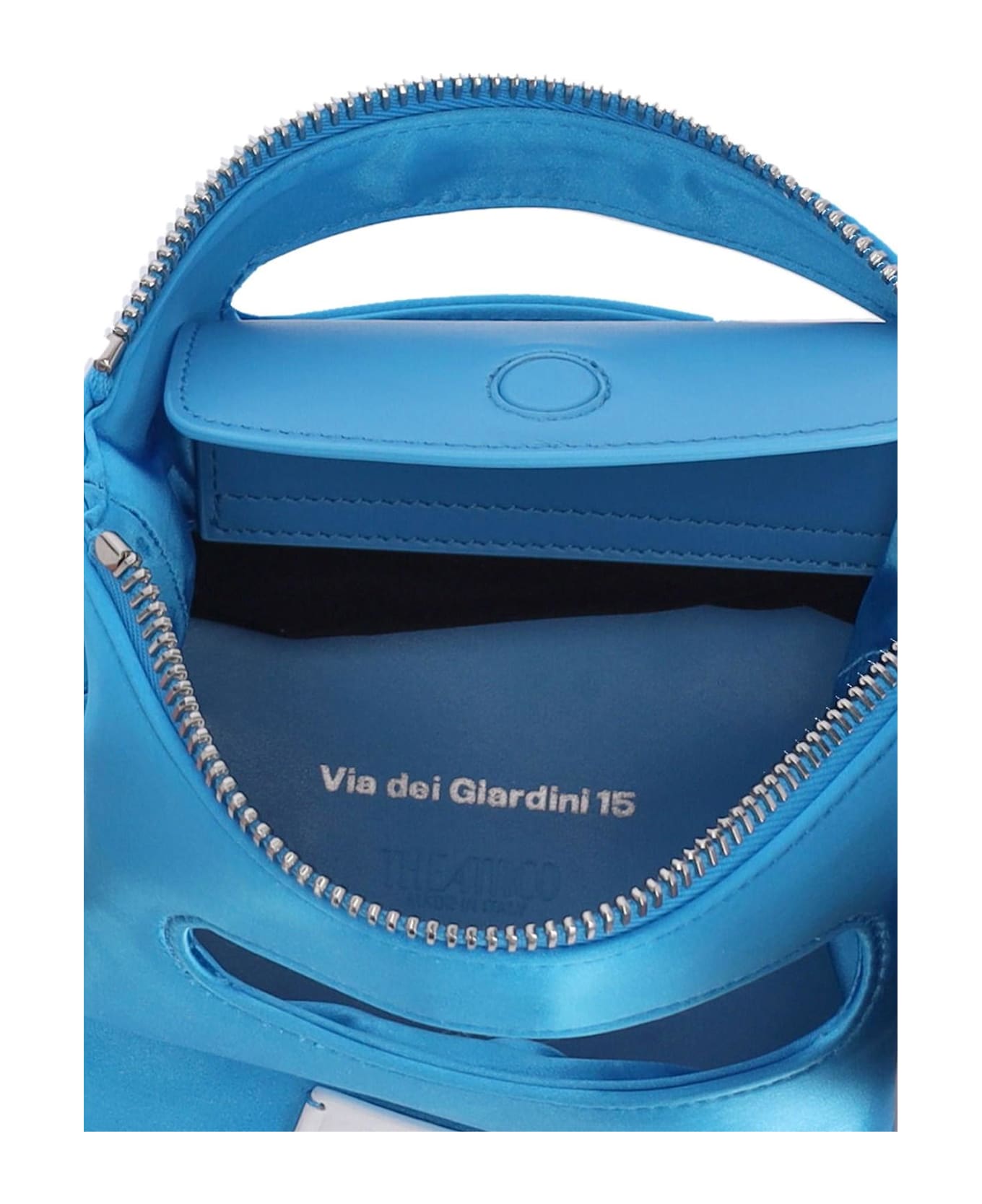 The Attico 'Via dei Giardini 15' mini bag in light blue satin fabric with handle, removable leather shoulder strap, zip closure, front logo label, inner magnetic button flat pocket, main inner compartment, metal feet on the bottom.