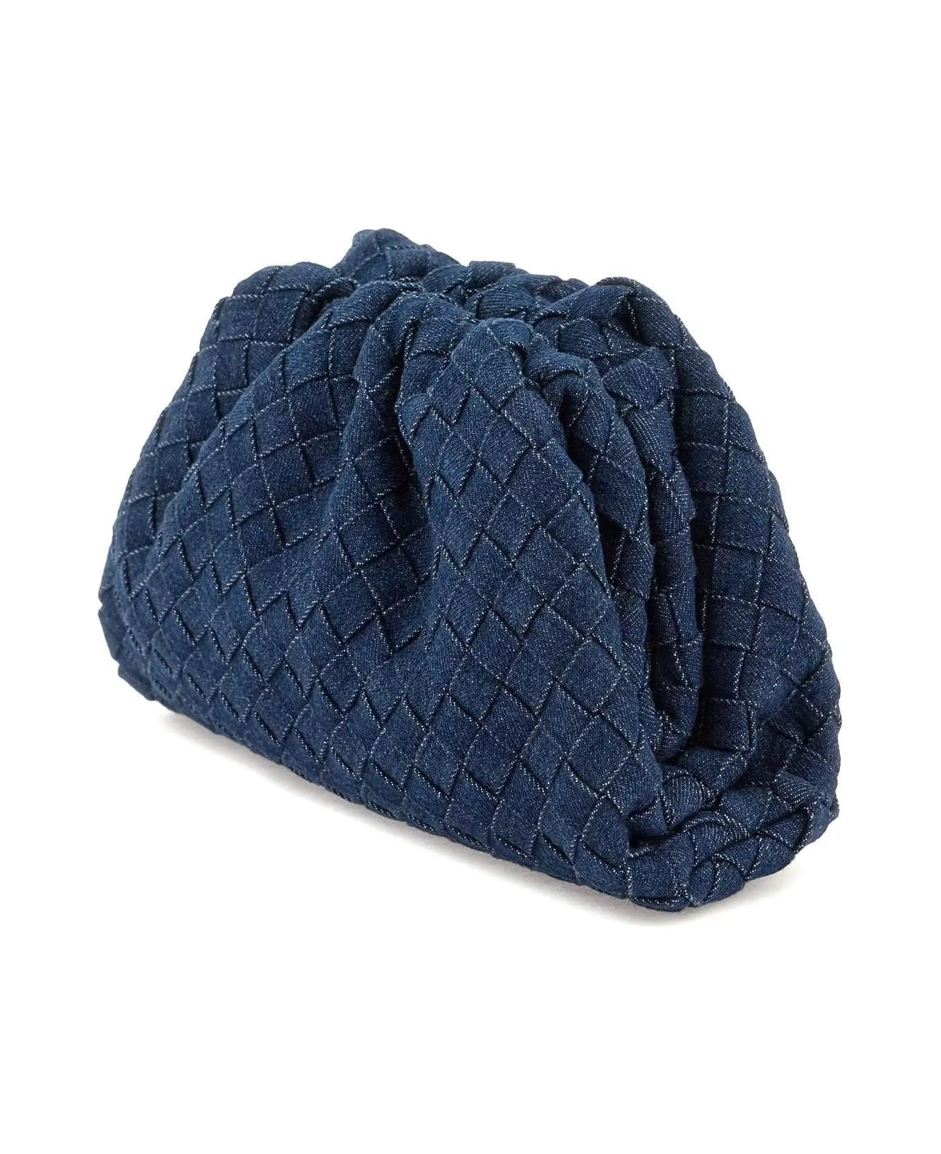 Bottega Veneta 'Teen Pouch' bag crafted in cotton denim with iconic Intrecciato motif. Hinged frame with magnetic closure and lined interior.