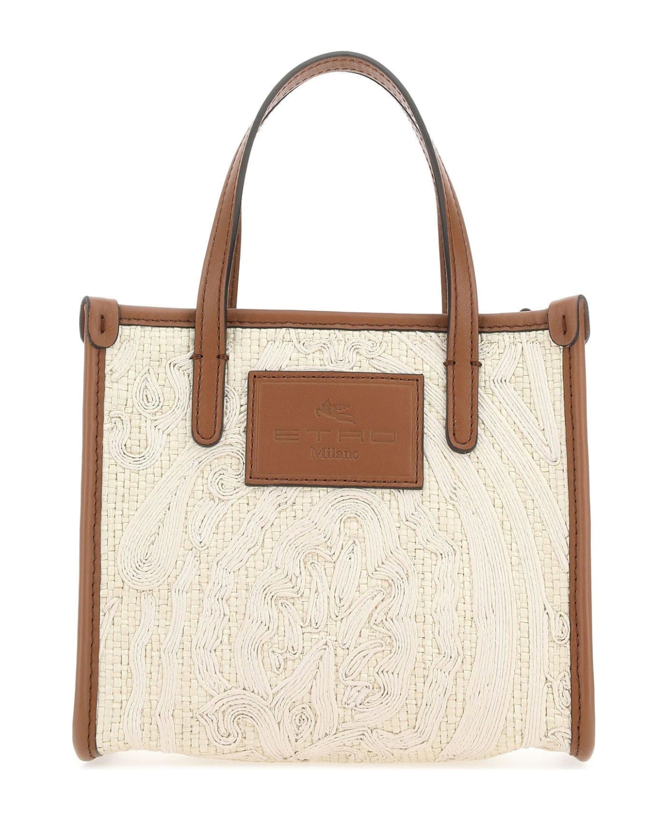 Shopping bag realized in nylon blend raffia characterized by Paisley embroidery on the entire surface. - Two flat leather handles - Adjustable detachable leather shoulder strap - Lined interior with a zip pocket Composition: Exterior: 65% Nylon 35% Cotton 100% Calf Lining: 66% Cotton 34% Polyester Finishing: Silver metal